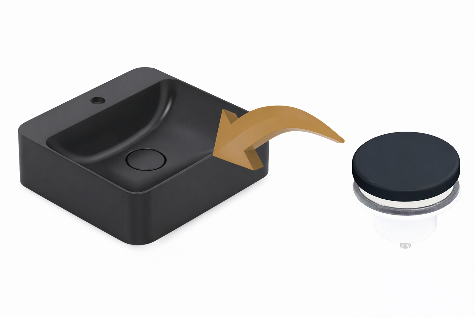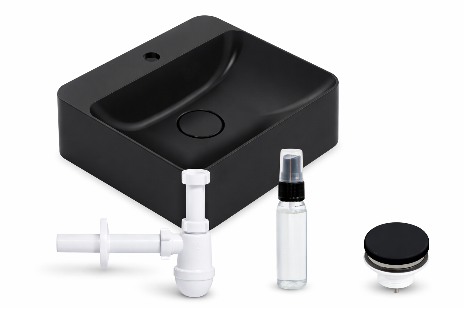 Umywalka nablatowa FIO 45 to nowoczesne i stylowe rozwiązanie dla osób, które szukają eleganckiej czarnej umywalki z kompletnym zestawem akcesoriów, bez konieczności dobierania elementów osobno.