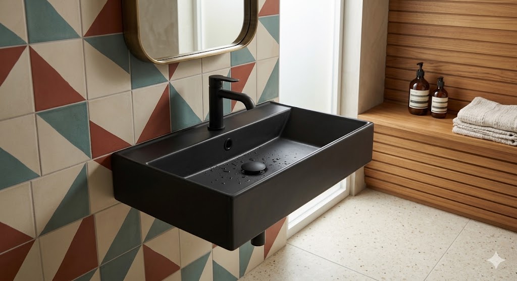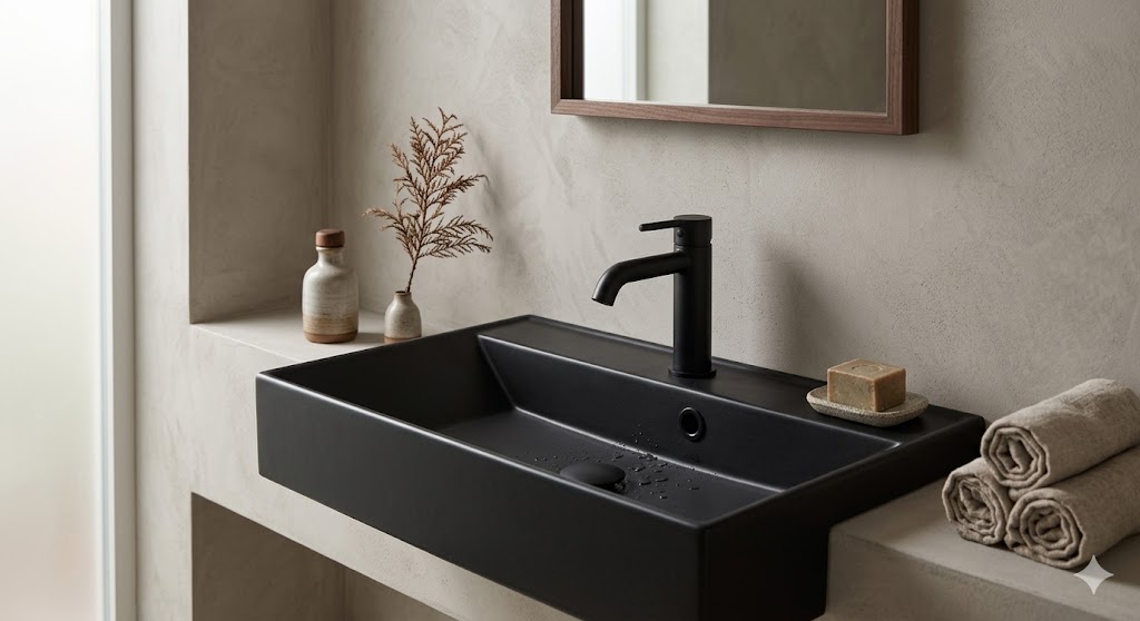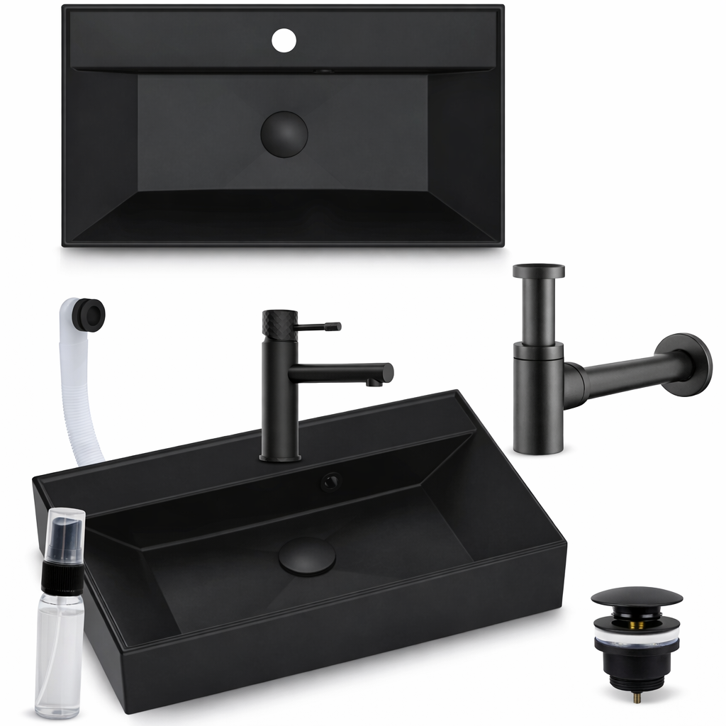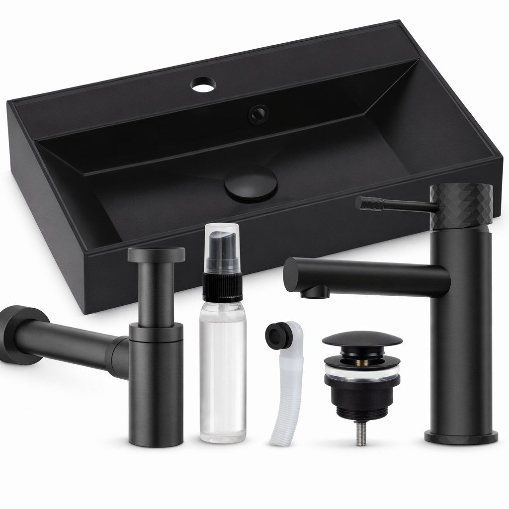 Model wyróżnia się eleganckim czarnym wykończeniem w macie z efektem połysku, które nadaje łazience nowoczesny i luksusowy charakter, a zastosowanie wysokiej jakości konglomeratu granitowego zapewnia wyjątkową trwałość, odporność na uszkodzenia oraz stabilność przez wiele lat użytkowania. Materiał ten skutecznie tłumi dźwięk wody, dzięki czemu korzystanie z umywalki jest komfortowe i niemal bezgłośne, a dodatkowo jest odporny na działanie środków chemicznych oraz zarysowania, co pozwala zachować idealny wygląd bez obaw o codzienne użytkowanie. Idealnie gładka, nieporowata powierzchnia zapobiega osadzaniu się kamienia i zabrudzeń, dzięki czemu czyszczenie jest szybkie i bezproblemowe, a intensywna czerń nie traci głębi koloru przez lata. Zestaw został wzbogacony o impregnat GRATIS, który dodatkowo chroni powierzchnię i wydłuża efekt „jak nowa”, a nowoczesna bateria wyposażona w diamentowe pokrętło zapewnia pewny chwyt i podkreśla ekskluzywny charakter całego zestawu. Praktyczność zwiększa również system klik-klak, umożliwiający szybkie i wygodne zamykanie odpływu jednym ruchem, a ergonomiczna konstrukcja baterii gwarantuje komfort użytkowania nawet mokrymi dłońmi. To rozwiązanie, które pozwala zaoszczędzić czas i uniknąć problemów z doborem kompatybilnych elementów, oferując gotowy zestaw do natychmiastowego montażu i użytkowania.
