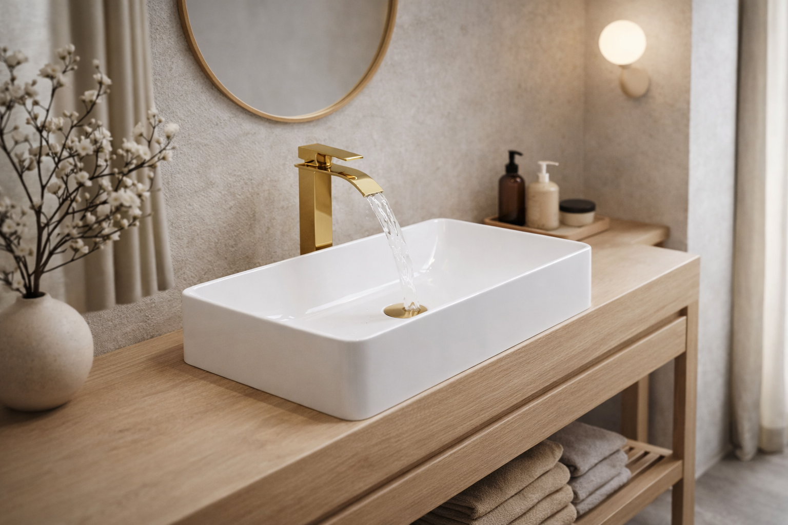Umywalka nablatowa LUMOS łączy nowoczesny styl z funkcjonalnością, doskonale wpisując się w różnorodne aranżacje łazienkowe.