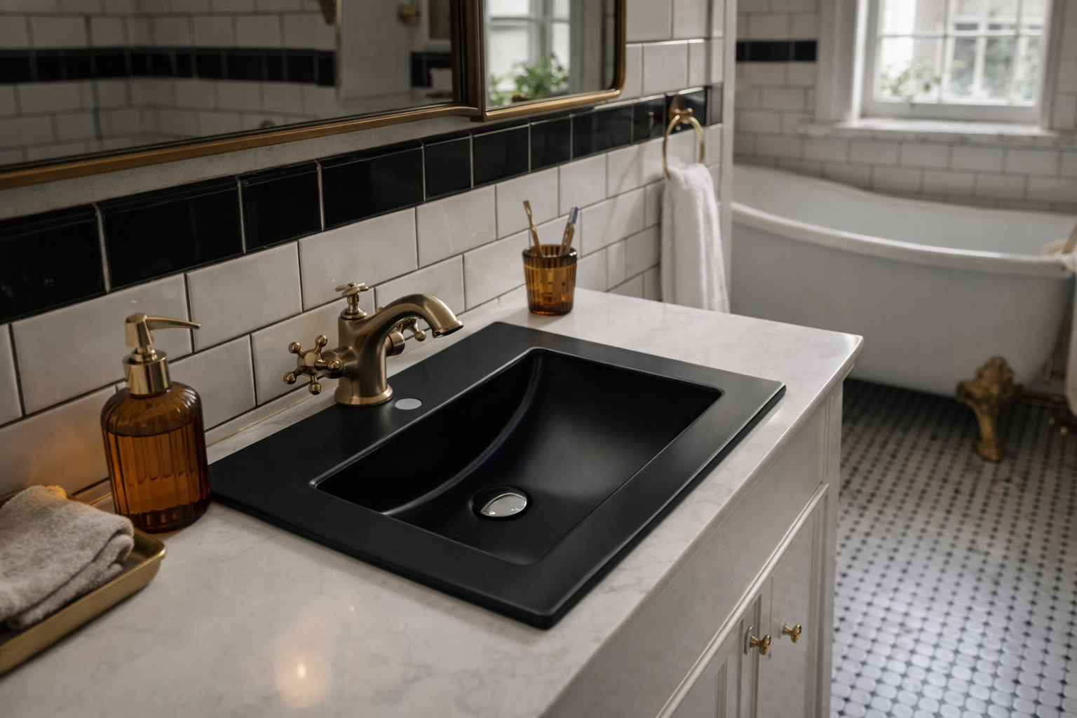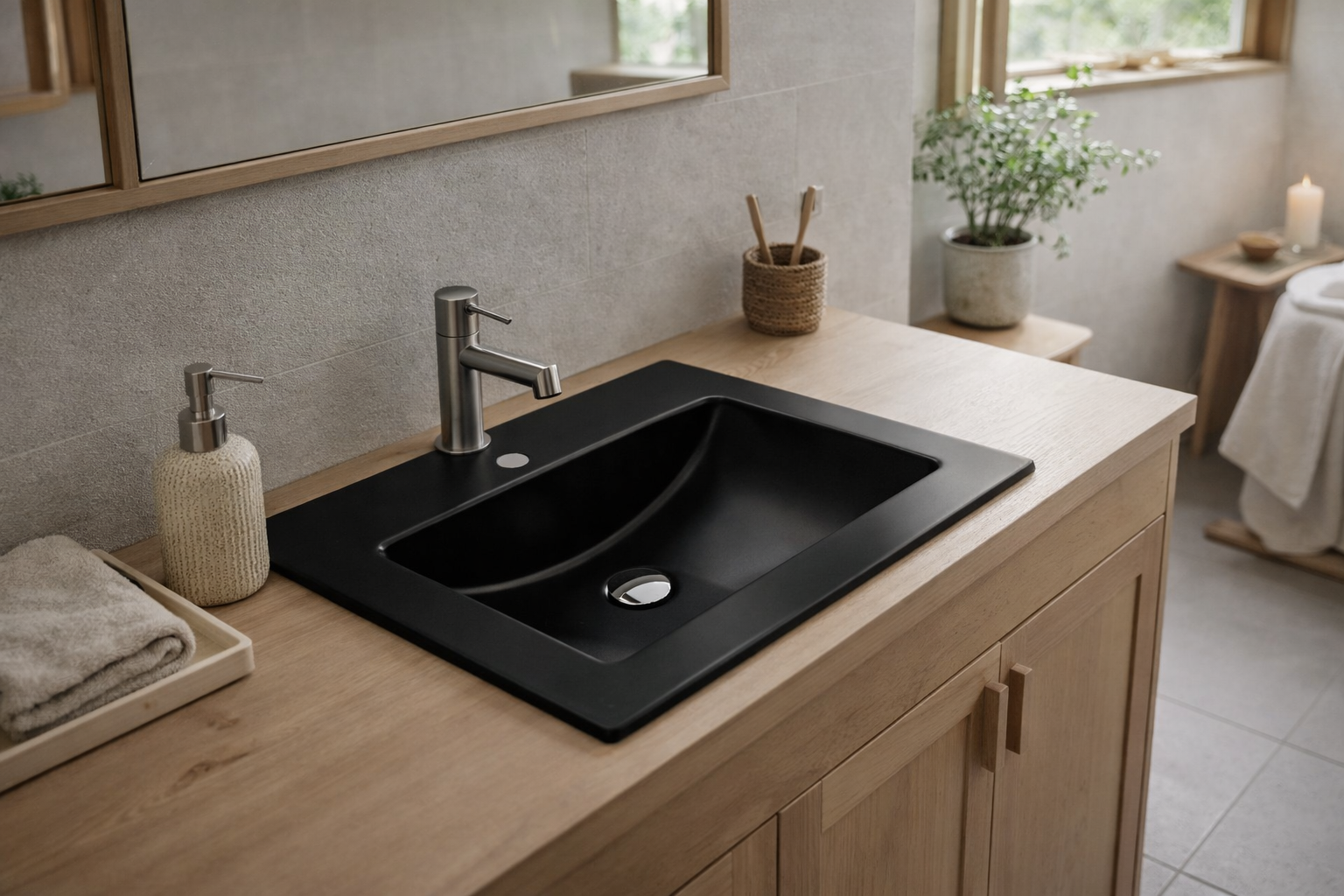 Model w klasycznym czarnym kolorze wyróżnia się prostą, prostokątną bryłą, dzięki czemu doskonale komponuje się zarówno z klasycznymi, jak i nowoczesnymi aranżacjami łazienkowymi. Montaż wpuszczany / naszafkowy / przyścienny pozwala na elastyczne dopasowanie do układu wnętrza, a konstrukcja sprawia, że umywalka nie wystaje ponad linię blatu, tworząc z nim jedną, spójną powierzchnię. Takie rozwiązanie zapewnia estetyczny i harmonijny efekt wizualny oraz optyczną lekkość zabudowy, co jest szczególnie istotne w mniejszych łazienkach. Gładka powierzchnia bez zbędnych załamań ułatwia utrzymanie czystości i codzienną pielęgnację. Zastosowany materiał gwarantuje trwałość oraz odporność na intensywne użytkowanie.