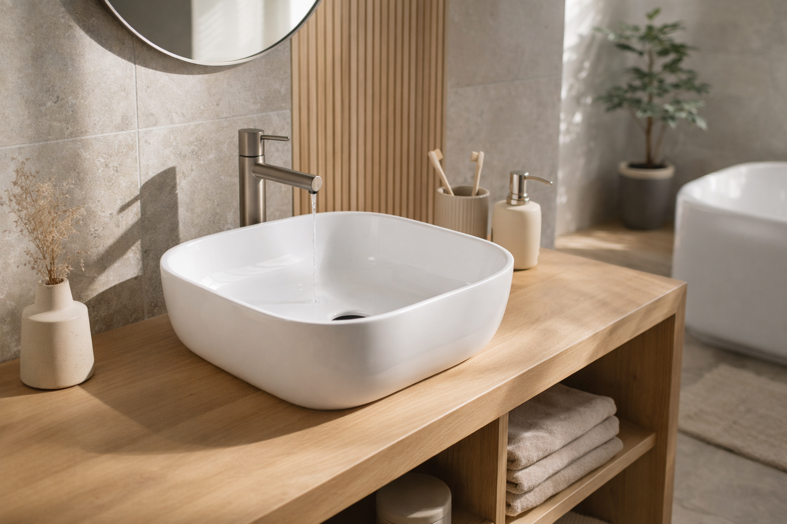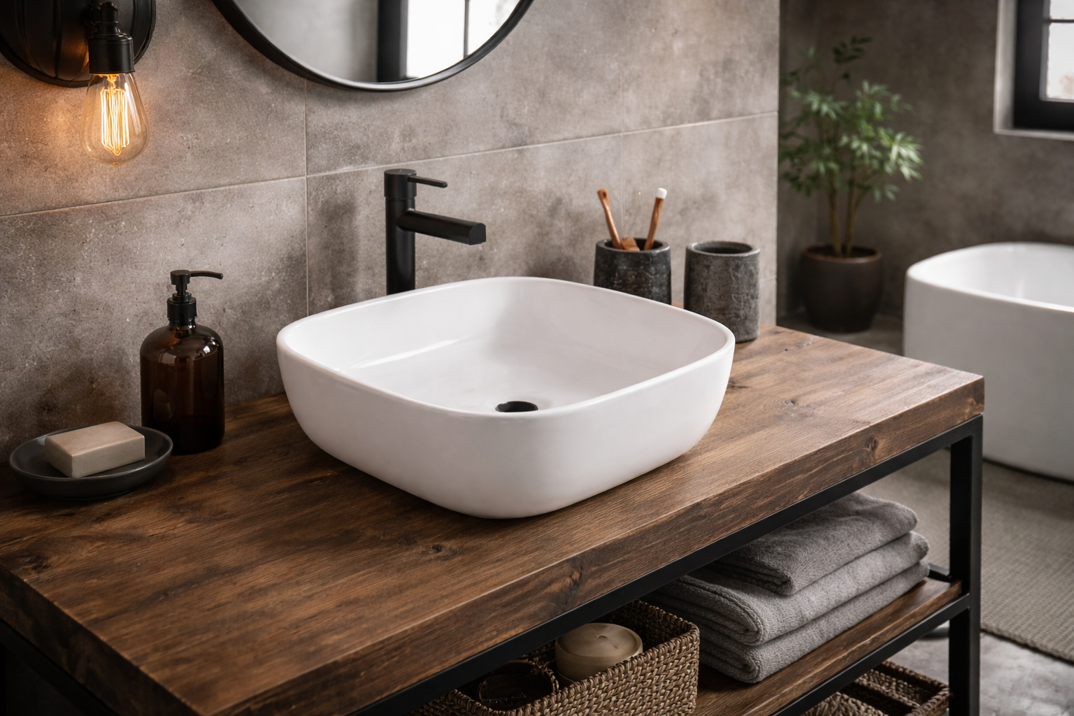 Model w klasycznym białym kolorze wyróżnia się wyrazistą, kwadratową formą, nadającą wnętrzu geometrycznej elegancji i podkreślającą minimalistyczny charakter aranżacji. Montaż nablatowypozwala wyeksponować bryłę umywalki i stworzyć estetyczną, uporządkowaną strefę umywalkową. Produkt został wykonany z wysokiej jakości ceramiki, która zapewnia trwałość oraz odporność na zarysowania i codzienne użytkowanie. Gładka powierzchnia ceramiczna ułatwia czyszczenie bez konieczności stosowania specjalistycznych środków i pozwala zachować estetyczny wygląd przez długi czas. Kompaktowe wymiary sprawiają, że model ROMA jest idealnym rozwiązaniem do mniejszych przestrzeni, gdzie liczy się funkcjonalność i ergonomia.