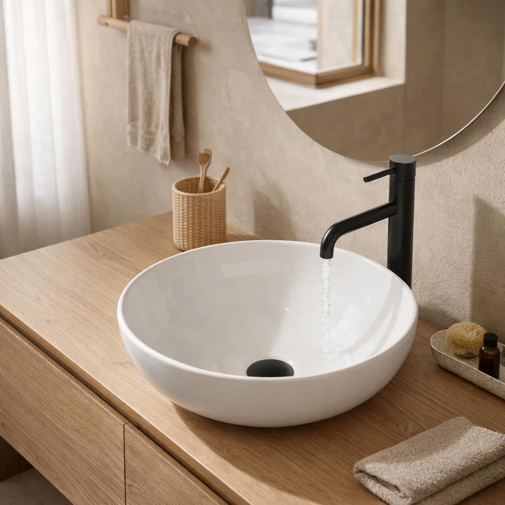 Umywalka nablatowa BANO to elegancki model o harmonijnym, okrągłym kształcie, który wprowadza do łazienki lekkość i minimalistyczny charakter.