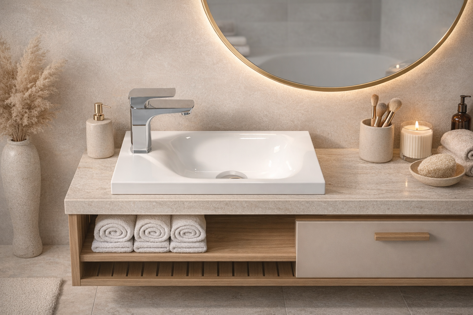 Wykonana z wysokiej jakości konglomeratu dolomitowego, zapewnia wyjątkową trwałość, odporność na uszkodzenia oraz stabilność, a jednocześnie wyróżnia się połyskiem na poziomie 90 GU, który jest wyraźnie wyższy niż w standardowych umywalkach ceramicznych, dzięki czemu prezentuje się bardziej nowocześnie i ekskluzywnie. Materiał ten skutecznie tłumi dźwięk wody, co sprawia, że użytkowanie jest komfortowe i niemal bezgłośne, a dodatkowo jest odporny na działanie środków chemicznych, co pozwala na bezproblemowe czyszczenie bez ryzyka uszkodzenia powierzchni. Idealnie gładka struktura bez porów zapobiega osadzaniu się kamienia i zabrudzeń, dzięki czemu utrzymanie czystości jest szybkie i łatwe, a umywalka zachowuje swój wygląd przez lata bez żółknięcia. Model MUSO oferuje elastyczność montażu, ponieważ może być instalowany zarówno jako umywalka wpuszczana w blat, jak i na szafce, co pozwala dopasować go do różnych aranżacji i potrzeb użytkownika. Prostokątny, minimalistyczny design doskonale wpisuje się w nowoczesne wnętrza, a kompaktowy format sprawia, że jest to idealny wybór do ograniczonej przestrzeni bez kompromisów w zakresie komfortu. Dodatkowym atutem jest ciepły w dotyku materiał, który szybko przyjmuje temperaturę otoczenia, zwiększając wygodę codziennego użytkowania.