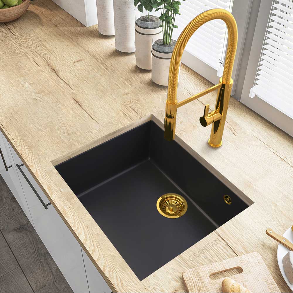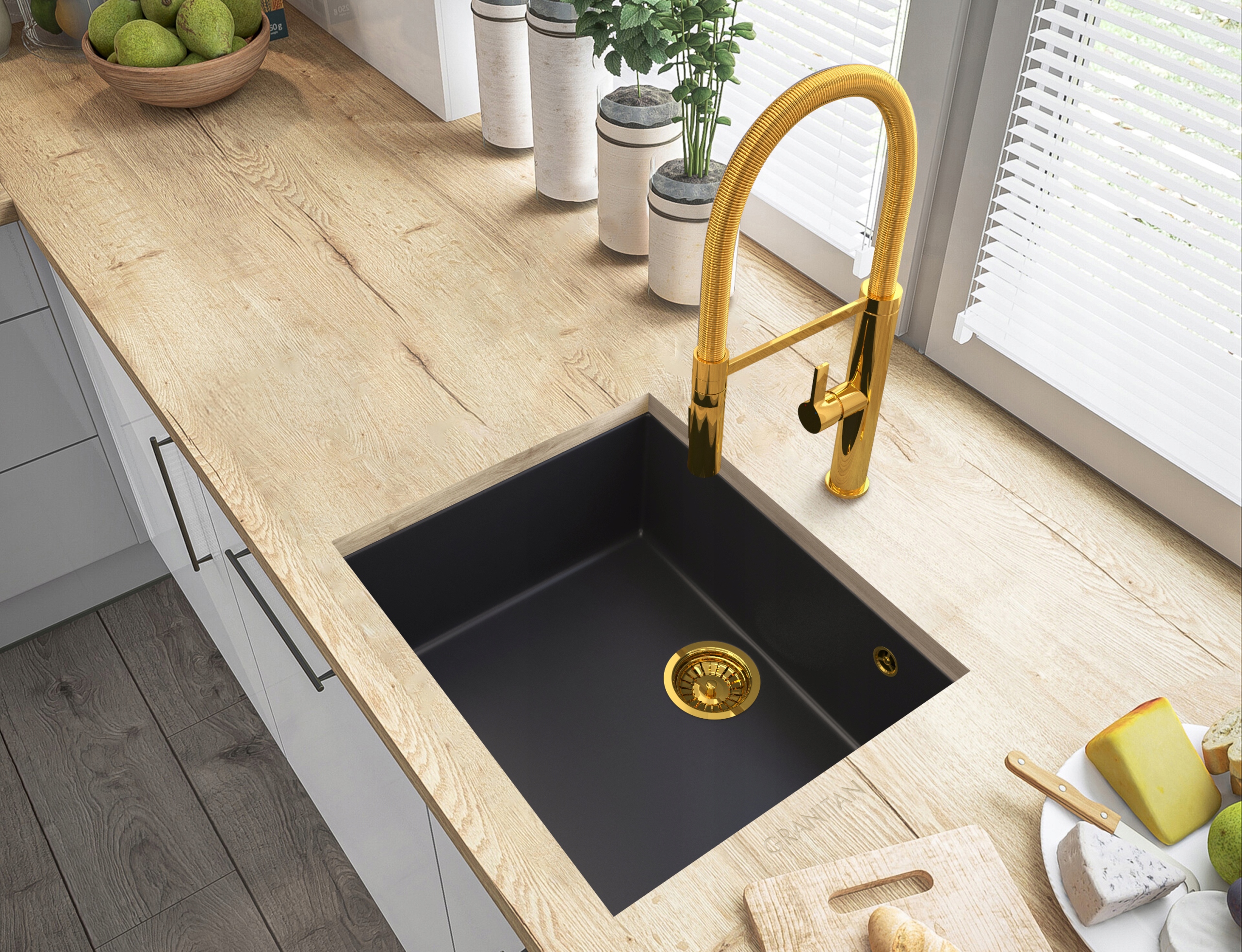 ● Bateria kuchenna FUSS o wysokiej jakości, wykonana z mosiądzu, w kolorze złotym. Powłoka baterii odporna na przebarwienia i wysoką temperaturę, ceramiczna głowica. Standardowy otwór montażowy 35 mm. Dwufunkcyjna słuchawka (dwa rodzaje strumienia wody), obrotowa 360', wyciągana wylewka.
