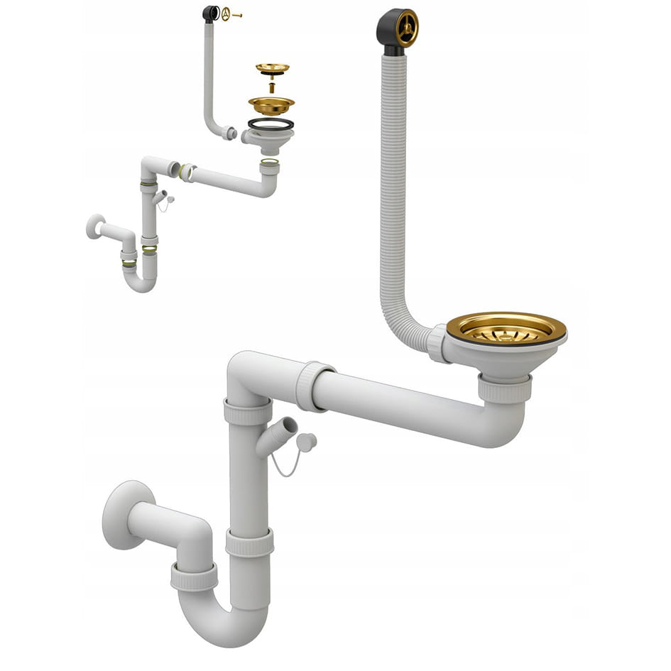 ● Syfon manualny przyścienny w kolorze złotym, oszczędzający przestrzeń z możliwością podłączenia pralki lub zmywarki.