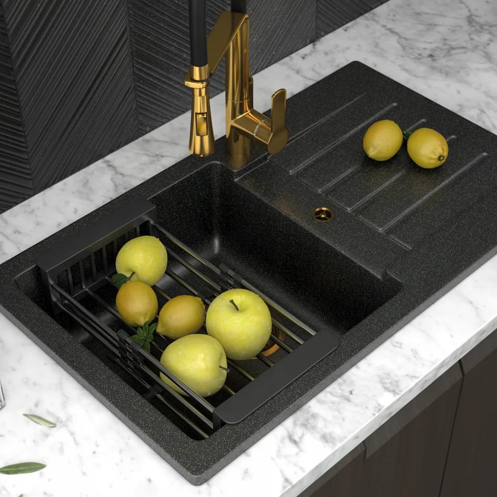 ● TRIX, wysokiej jakości granitowy, jednokomorowy zlewozmywak do szafki od 50 cm, w kolorze czarnym z drobinkami złota. Wyprodukowany przez polskiego producenta. Gwarancja najwyższej wytrzymałości, dzięki specjalnej mieszance granitan plusR – odpornej na przebarwienia i zarysowania. Cechuje go wysoka odporność na gwałtowne zmiany temperatury (-18+280 stopni) oraz matowa, łatwa do czyszczenia powierzchnia.