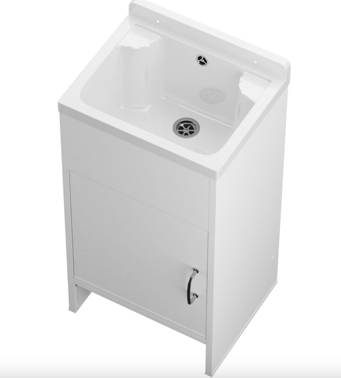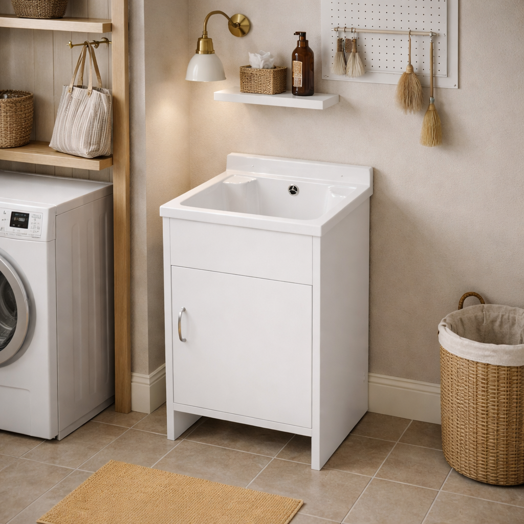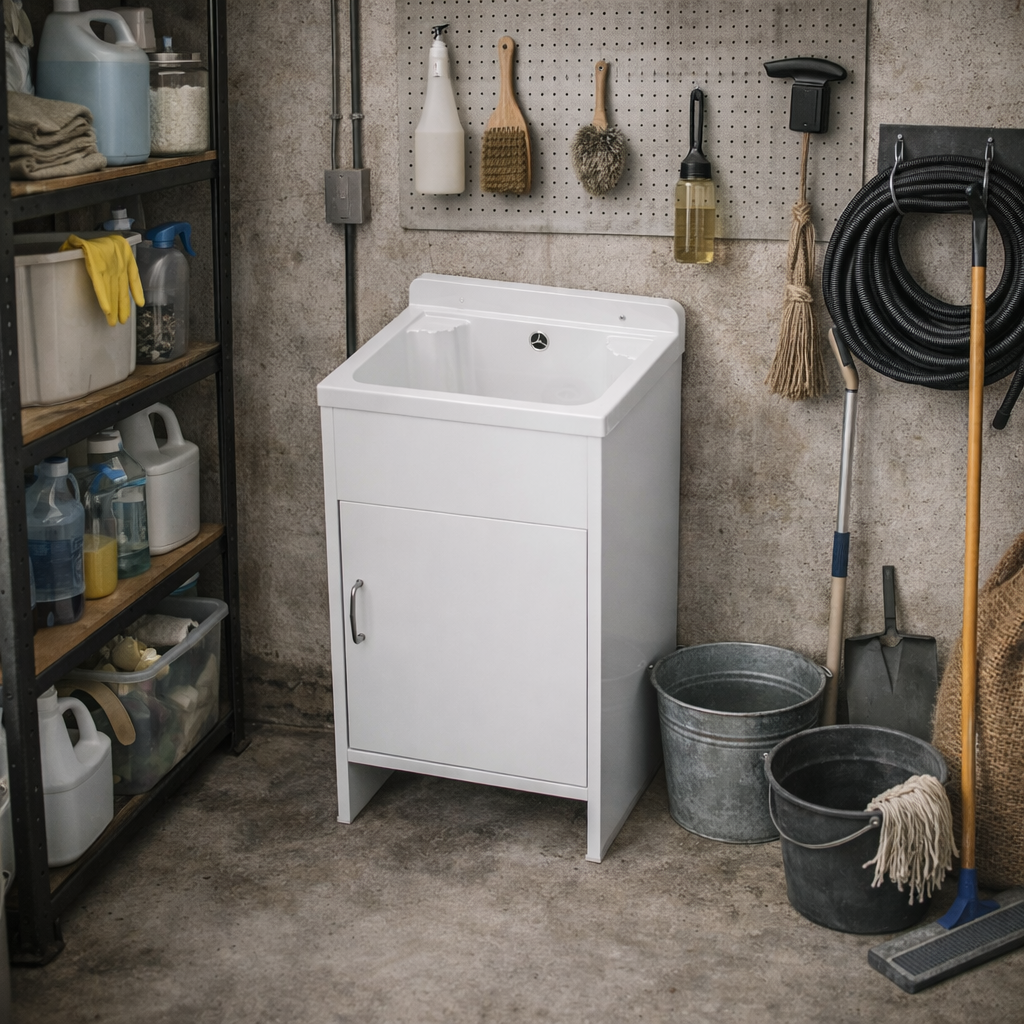 Kompaktowa komora gospodarcza HOKA w kolorze białym w połączeniu z lekką i odporną na wilgoć szafką PCV tworzy funkcjonalny zestaw, który sprawdzi się zarówno w domu, jak i w budynkach użyteczności publicznej. Komora została wykonana z wysokiej jakości polipropylenu, który wykazuje odporność na działanie rozpuszczalników, zasad i kwasów oraz nie absorbuje wody, dzięki czemu doskonale nadaje się do intensywnego użytkowania w warunkach technicznych. Kompaktowe wymiary umożliwiają montaż nawet w mniejszych przestrzeniach, zapewniając wygodę podczas codziennych prac porządkowych. W komplecie znajduje się syfon oraz zestaw montażowy, co pozwala na szybkie podłączenie bez konieczności dokupowania dodatkowych elementów. Szafka PCV charakteryzuje się odpornością na wilgoć, nie wymaga konserwacji i nie jest narażona na pęcznienie ani odkształcenia, a jej prosta, funkcjonalna forma umożliwia estetyczne ukrycie instalacji odpływowej. Neutralny biały kolor sprawia, że zestaw harmonijnie wpisuje się w przestrzenie techniczne i użytkowe.