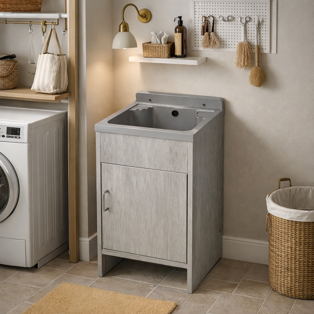 Kompaktowa komora gospodarcza HOKA w kolorze szarym w połączeniu z lekką i odporną na wilgoć szafką PCV tworzy funkcjonalny zestaw, który sprawdzi się zarówno w domu, jak i w budynkach użyteczności publicznej. Komora została wykonana z wysokiej jakości polipropylenu, który wykazuje odporność na działanie rozpuszczalników, zasad i kwasów oraz nie absorbuje wody, dzięki czemu doskonale nadaje się do intensywnego użytkowania w warunkach technicznych. Kompaktowe wymiary umożliwiają montaż nawet w mniejszych przestrzeniach, zapewniając wygodę podczas codziennych prac porządkowych. W komplecie znajduje się syfon oraz zestaw montażowy, co pozwala na szybkie podłączenie bez konieczności dokupowania dodatkowych elementów. Szafka PCV charakteryzuje się odpornością na wilgoć, nie wymaga konserwacji i nie jest narażona na pęcznienie ani odkształcenia, a jej prosta, funkcjonalna forma umożliwia estetyczne ukrycie instalacji odpływowej. Neutralny szary kolor sprawia, że zestaw harmonijnie wpisuje się w przestrzenie techniczne i użytkowe.