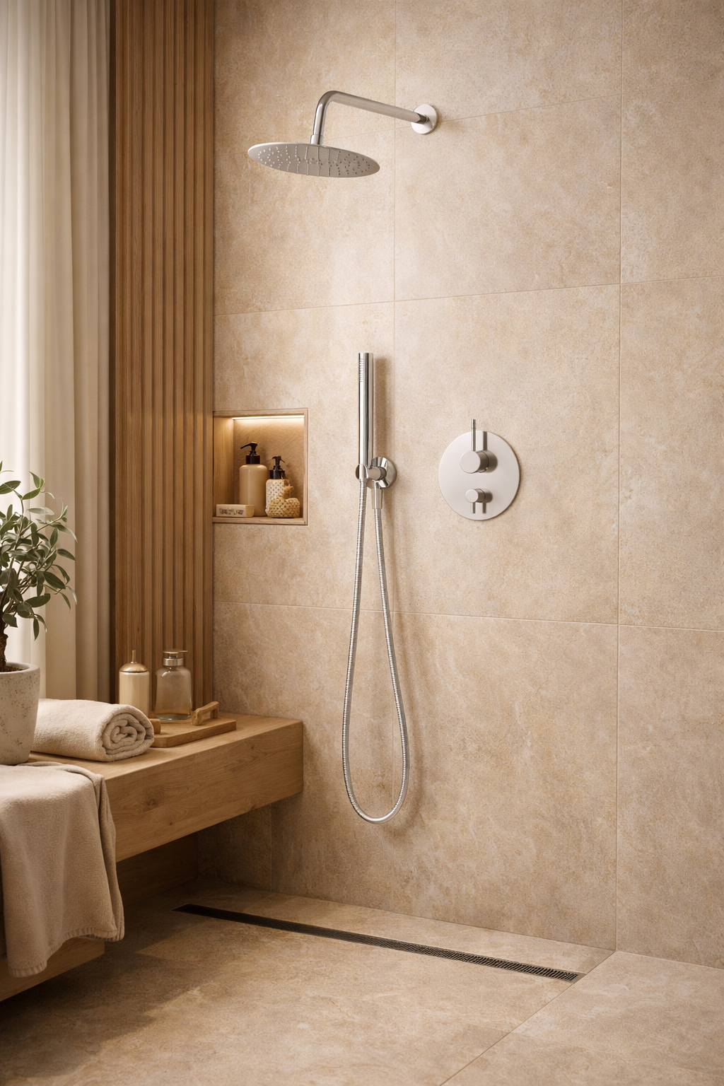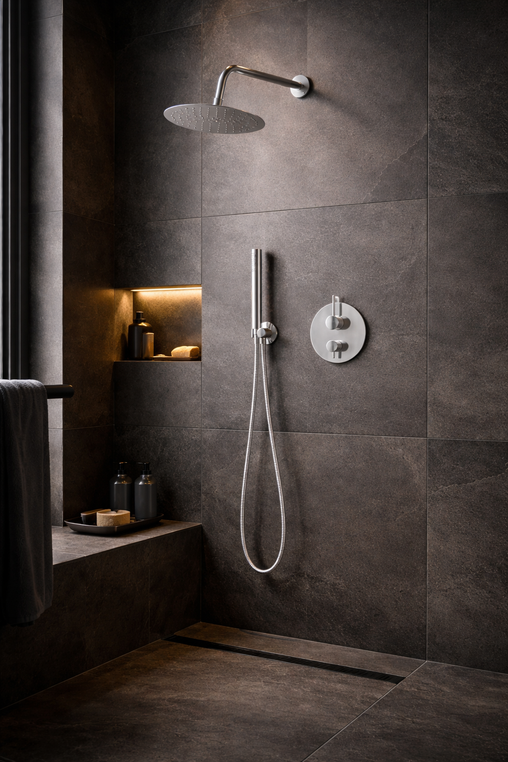 Zestaw natryskowy podtynkowy GAMO z deszczownicą to nowoczesne i minimalistyczne rozwiązanie do eleganckich łazienek, w których liczy się czysta forma i komfort codziennego użytkowania. Podtynkowy system montażu pozwala ukryć elementy instalacyjne w ścianie, dzięki czemu strefa prysznicowa zyskuje uporządkowany, estetyczny wygląd i jest łatwiejsza w utrzymaniu czystości. Srebrne wykończenie nadaje wnętrzu wyrazisty, loftowy i industrialny charakter.