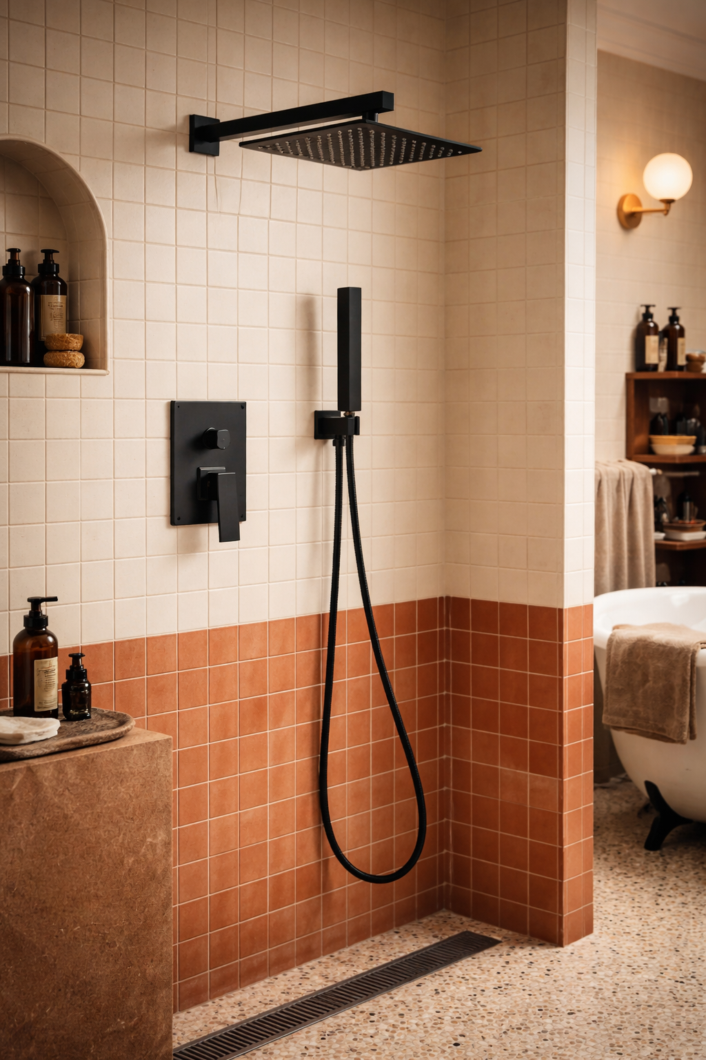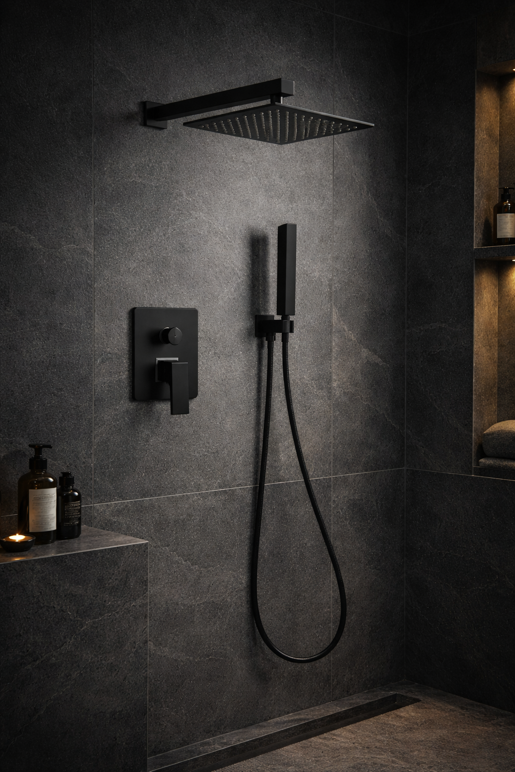 Zestaw natryskowy prysznicowy podtynkowy ZONE5 to nowoczesne i eleganckie rozwiązanie do łazienek, w których liczy się minimalistyczny design, komfort użytkowania i estetyczna spójność. Podtynkowy system montażu pozwala ukryć elementy instalacyjne w ścianie, dzięki czemu strefa prysznicowa zyskuje czysty, uporządkowany wygląd. Czarne wykończenie w połączeniu z geometryczną formą nadaje wnętrzu ponadczasowy, premium charakter.