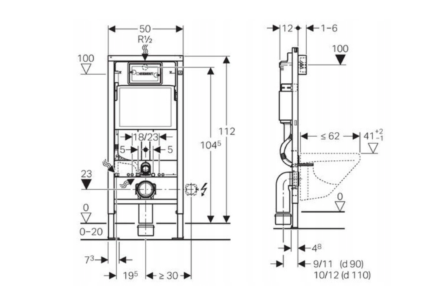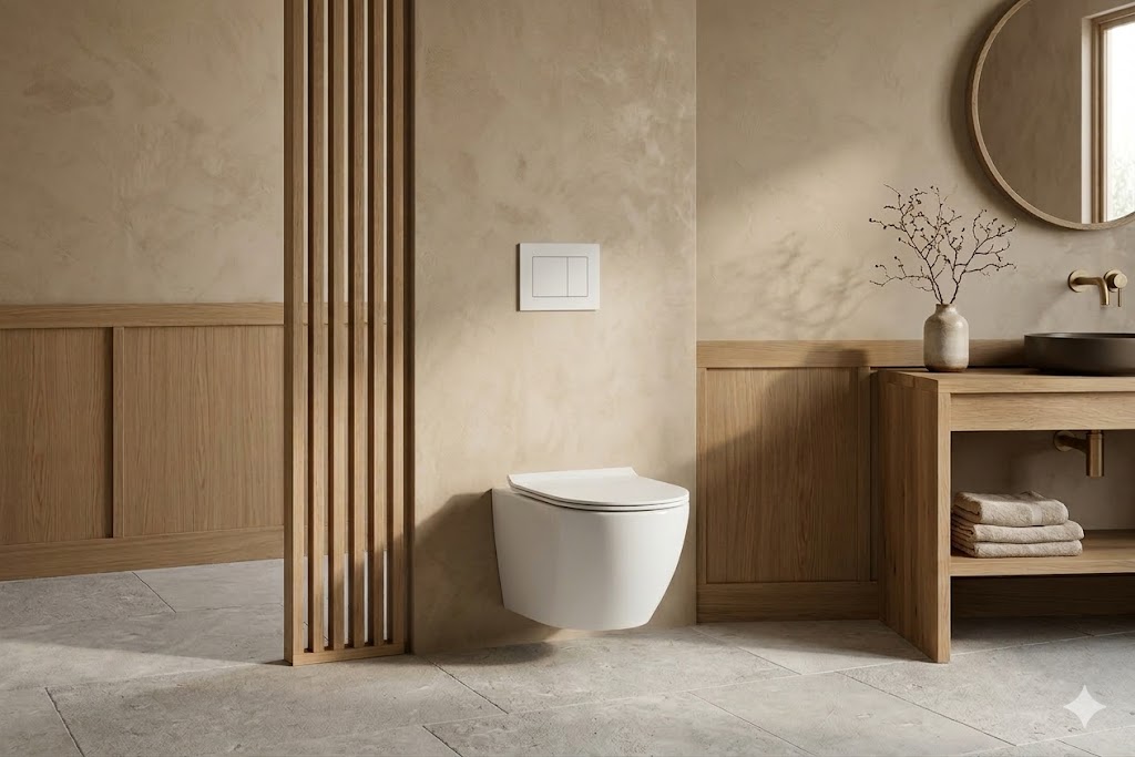 Sercem zestawu jest stelaż podtynkowy Geberit UP100, ceniony za trwałość i niezawodność. Samonośna stalowa rama malowana proszkowo zapewnia stabilność konstrukcji oraz wytrzymałość do 400 kg, a regulowane nogi w zakresie 0–20 cm umożliwiają dopasowanie wysokości montażu do warunków instalacyjnych. Spłuczka wyposażona jest w dwudzielny system spłukiwania, który pozwala ograniczyć zużycie wody, a także w izolację przeciwroszeniową, chroniącą przed skraplaniem wilgoci. System umożliwia regulację ilości wody spłukującej, natychmiastowe ponowne spłukiwanie oraz podłączenie wody od góry lub z tyłu, co zwiększa elastyczność instalacji.