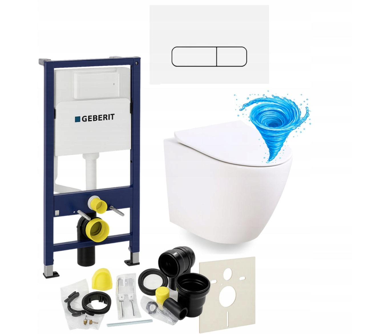 Zestaw zawiera również wszystkie elementy montażowe, w tym matę wygłuszającą, zestaw przyłączeniowy z rurą spłukującą, kolankiem odpływowym i uszczelkami oraz śruby, wsporniki i zaślepki, dzięki czemu instalacja jest szybka i wygodna. System przeznaczony jest do montażu w ścianie murowanej lub zabudowie z płyt gipsowo-kartonowych i kompatybilny z miskami WC wiszącymi o rozstawie otworów 18 cm lub 23 cm oraz przyciskami Geberit Delta.