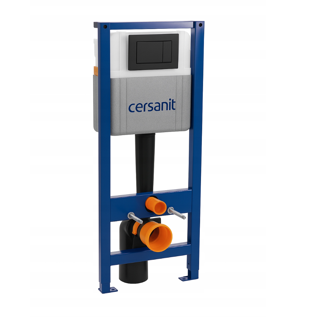 Sercem zestawu jest stelaż CERSANIT MITO, wykonany z solidnej i stabilnej konstrukcji, która gwarantuje trwałość oraz niezawodne działanie przez wiele lat. System wyposażony jest w cichy mechanizm spłukiwania, izolację akustyczną i cieplną zbiornika oraz możliwość wyboru kilku wariantów spłukiwania (2/4, 3/5, 3/6 l), co pozwala ograniczyć zużycie wody i obniżyć rachunki. Regulowana wysokość w zakresie 116,5–136,5 cm oraz poziomy odpływułatwiają dopasowanie instalacji do różnych warunków montażowych.