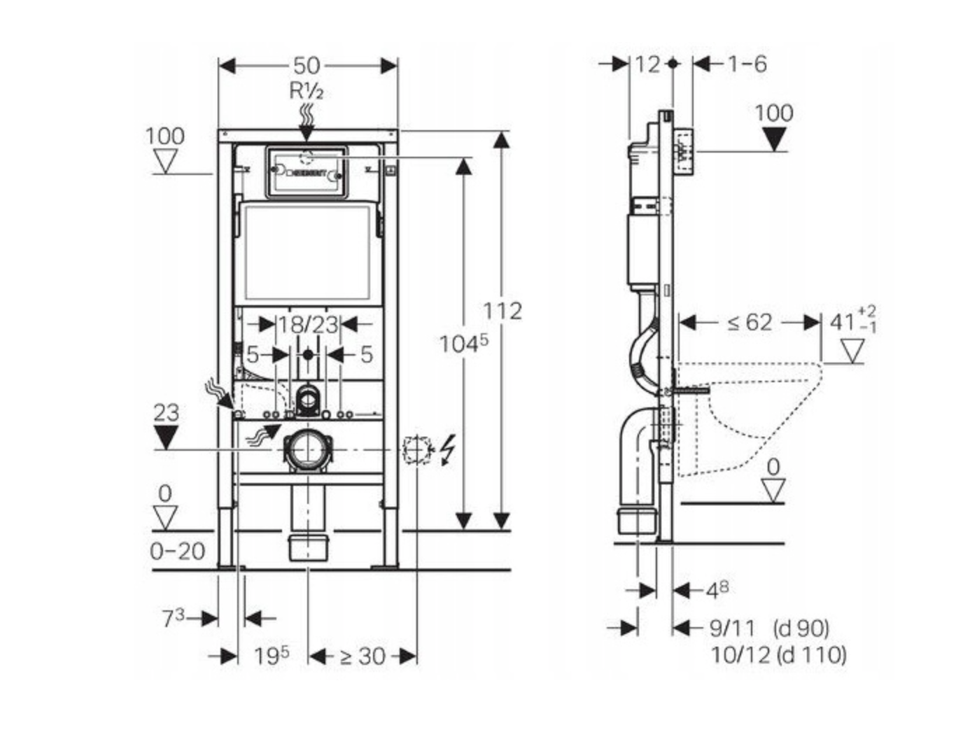 Sercem zestawu jest stelaż podtynkowy Geberit UP100, ceniony za trwałość i niezawodność. Samonośna konstrukcjao wytrzymałości do 400 kg gwarantuje stabilność i bezpieczeństwo użytkowania, a regulowane nogi w zakresie 0–20 cm umożliwiają dopasowanie wysokości montażu. Minimalna głębokość zabudowy 12 cm pozwala na instalację nawet w ograniczonej przestrzeni. System wyposażony jest w izolację przeciwroszeniową, dwudzielny system spłukiwaniaoraz możliwość regulacji ilości wody, co przekłada się na realną oszczędność wody. Dodatkowo możliwe jest natychmiastowe ponowne spłukiwanie, a przyłącze wody od góry lub z tyłu zwiększa elastyczność montażu.