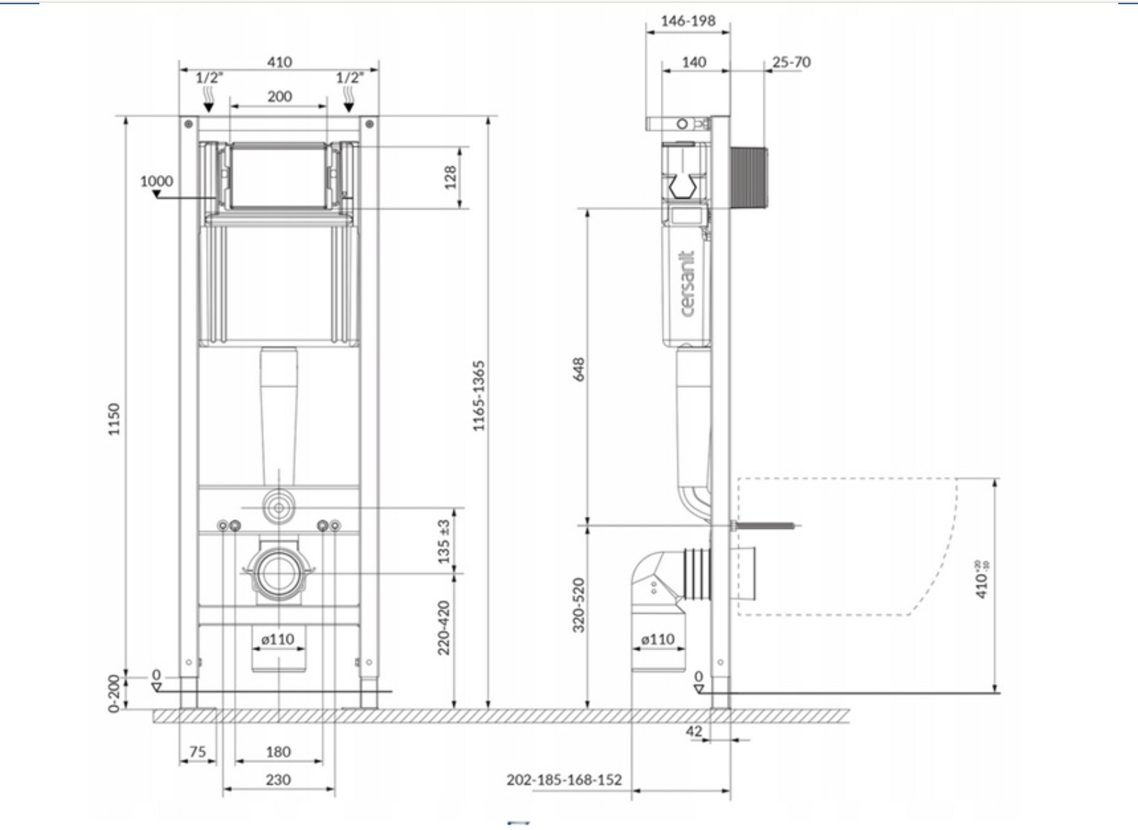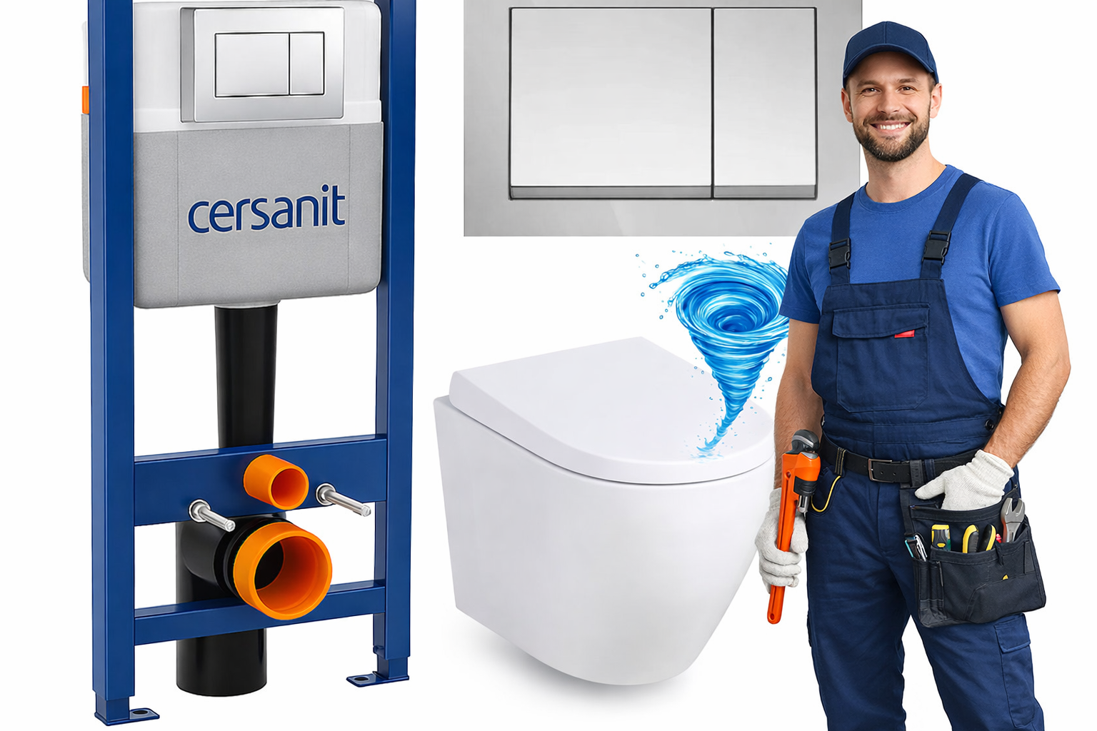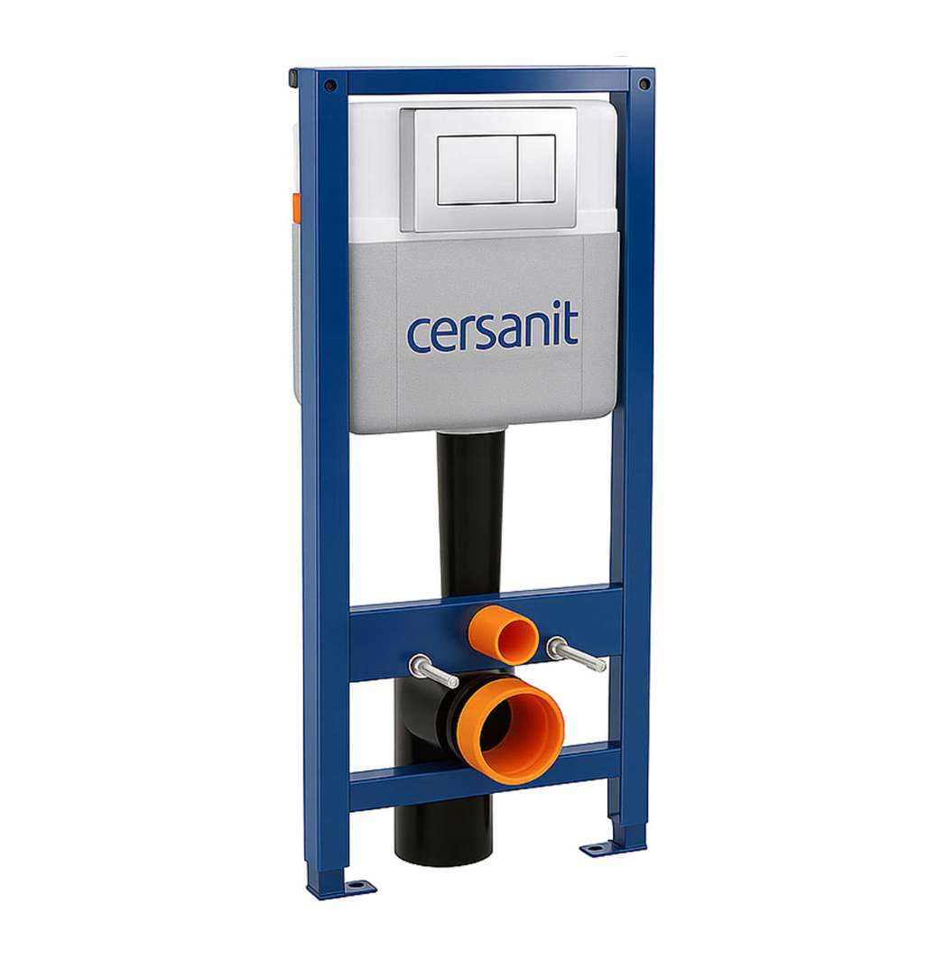 Podstawą zestawu jest stelaż CERSANIT MITO, wykonany z wytrzymałej stalowej konstrukcji, która zapewnia stabilność i długą żywotność. Model posiada regulowaną wysokość w zakresie 116,5–136,5 cm, co umożliwia dopasowanie instalacji do różnych warunków montażowych. System wyposażony jest w cichy mechanizm spłukiwania, izolację akustyczną i cieplną zbiornika oraz zawór odcinający, który pozwala kontrolować przepływ wody. Dwudzielny system spłukiwania umożliwia ustawienie kilku wariantów zużycia wody – 2/4 l, 3/5 l lub 3/6 l, co pozwala ograniczyć koszty eksploatacji bez utraty skuteczności.