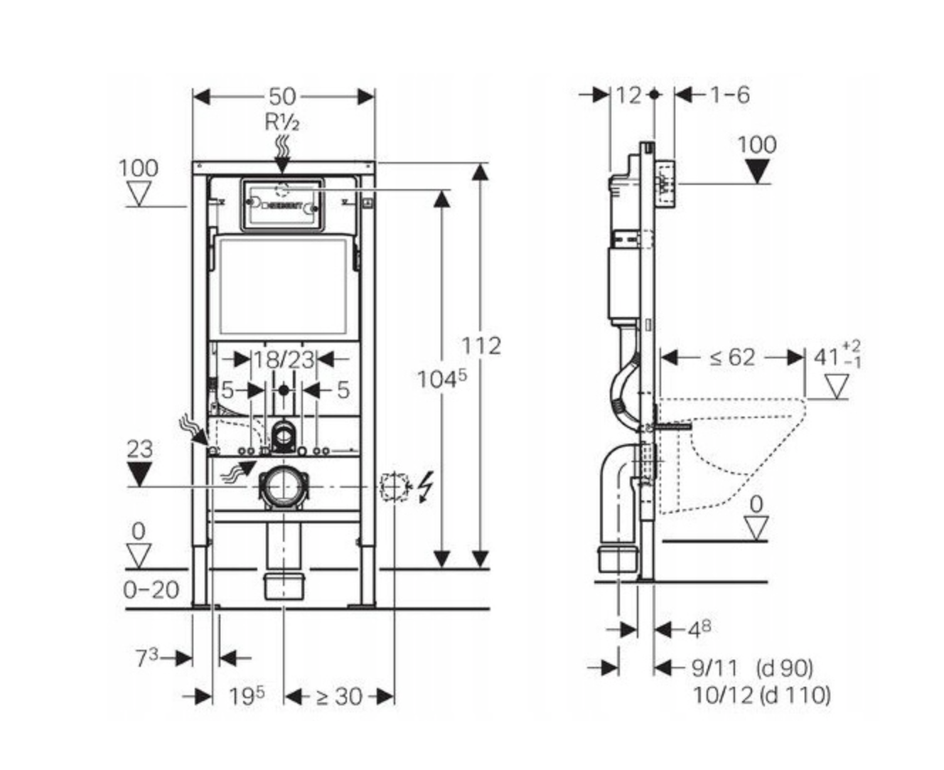 Sercem zestawu jest stelaż Geberit UP100, ceniony za niezawodność i trwałość. Samonośna konstrukcja o wytrzymałości do 400 kg gwarantuje stabilność i bezpieczeństwo użytkowania przez lata. System wyposażony jest w spłuczkę uruchamianą od przodu, izolację przeciwroszeniową oraz dwudzielny system spłukiwania z możliwością regulacji ilości wody, co pozwala ograniczyć jej zużycie. Regulowane nogi w zakresie 0–20 cm oraz minimalna głębokość zabudowy 12 cm umożliwiają łatwy montaż nawet w ograniczonej przestrzeni, a przyłącze wody od góry lub z tyłu zwiększa elastyczność instalacji.