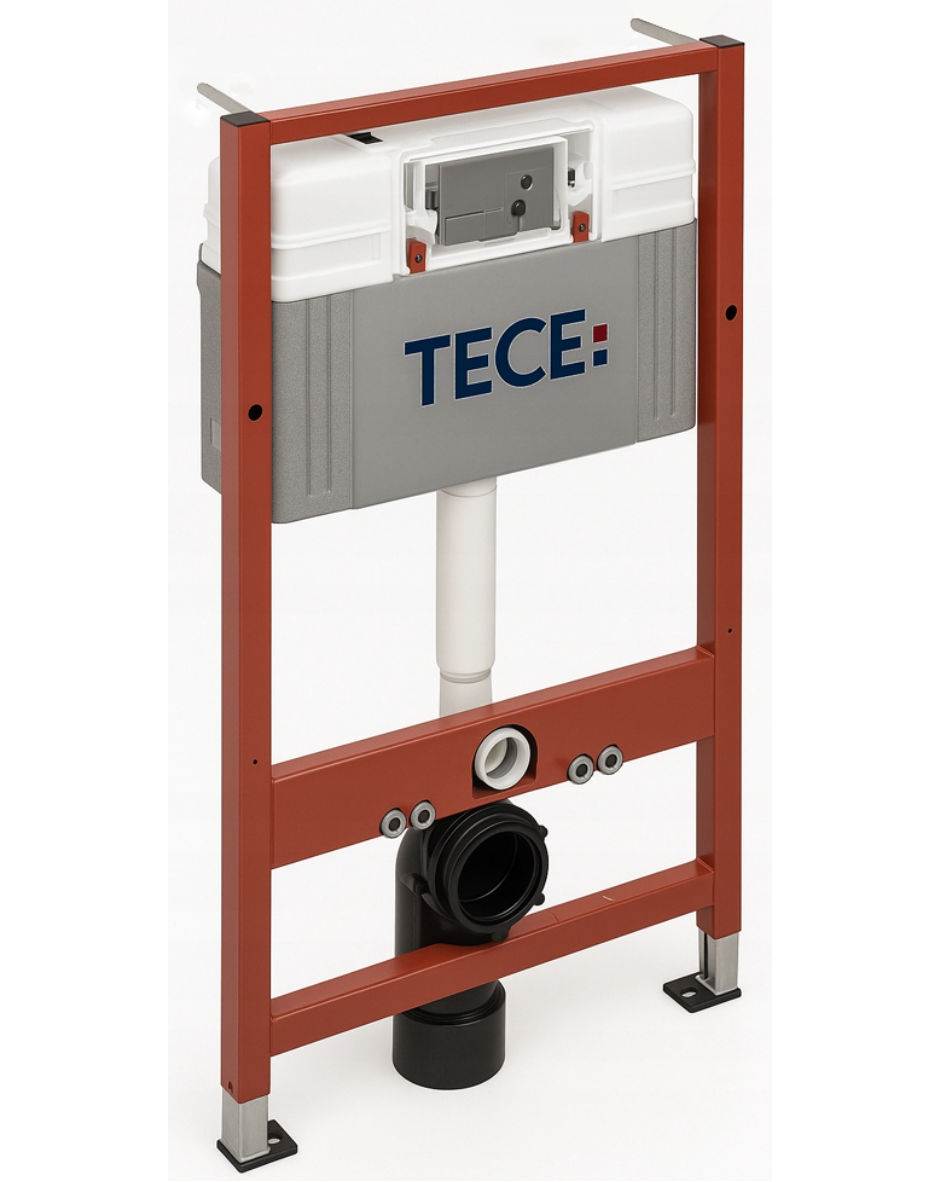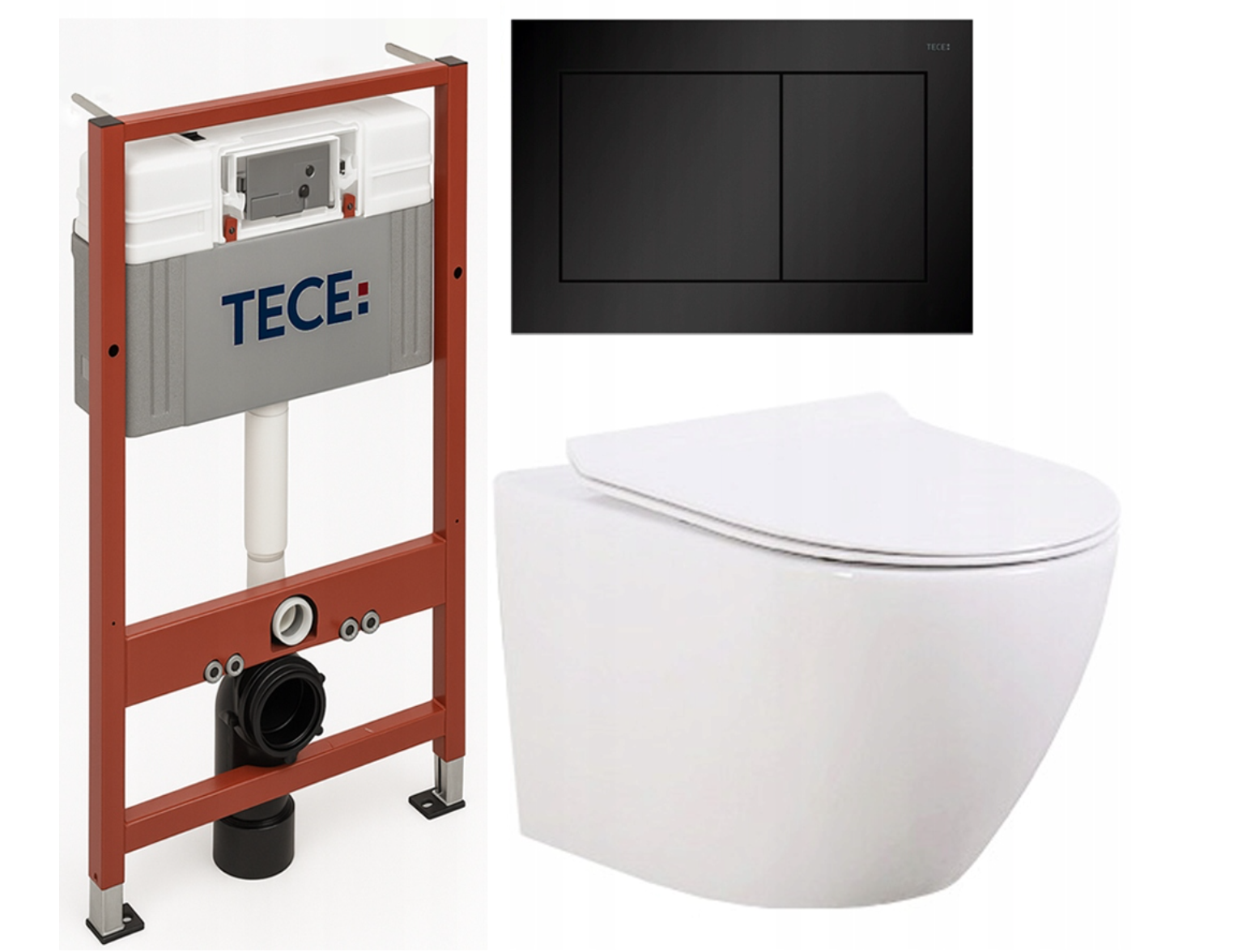 Podstawą zestawu jest stelaż podtynkowy TECE, wykonany z solidnej i trwałej konstrukcji, która zapewnia stabilność i niezawodność na długie lata. System wyposażony jest w spłuczkę uruchamianą z przodu, izolację przeciwroszeniową, a także możliwość regulacji ilości wody spłukującej, co pozwala dopasować działanie do indywidualnych potrzeb i ograniczyć zużycie wody. Dodatkowo stelaż oferuje natychmiastowe ponowne spłukiwanie, przyłącze wody od góry lub z tyłu, a także regulowane nogi w zakresie 0–20 cm, co ułatwia montaż w różnych warunkach. Samonośna rama malowana proszkowo oraz głębokość zabudowy 15 cm zapewniają trwałość i uniwersalność zastosowania.