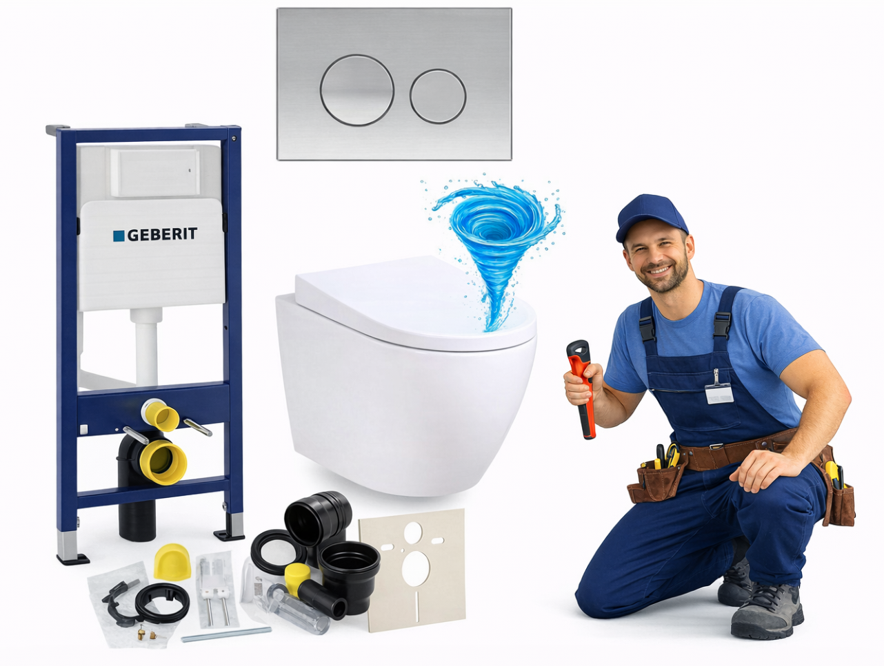 Sercem zestawu jest stelaż podtynkowy Geberit UP100, ceniony za trwałość i niezawodność. Samonośna stalowa rama malowana proszkowo zapewnia stabilność konstrukcji oraz wytrzymałość do 400 kg, a regulowane nogi w zakresie 0–20 cm umożliwiają dopasowanie wysokości montażu do warunków instalacyjnych. Spłuczka wyposażona jest w dwudzielny system spłukiwania, który pozwala ograniczyć zużycie wody, a także w izolację przeciwroszeniową, chroniącą przed skraplaniem wilgoci. System umożliwia regulację ilości wody spłukującej, natychmiastowe ponowne spłukiwanie oraz podłączenie wody od góry lub z tyłu, co zwiększa elastyczność instalacji.