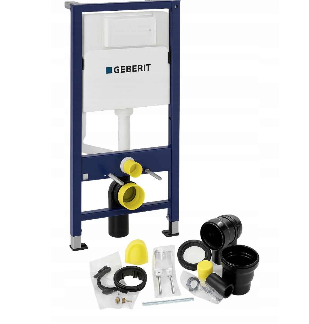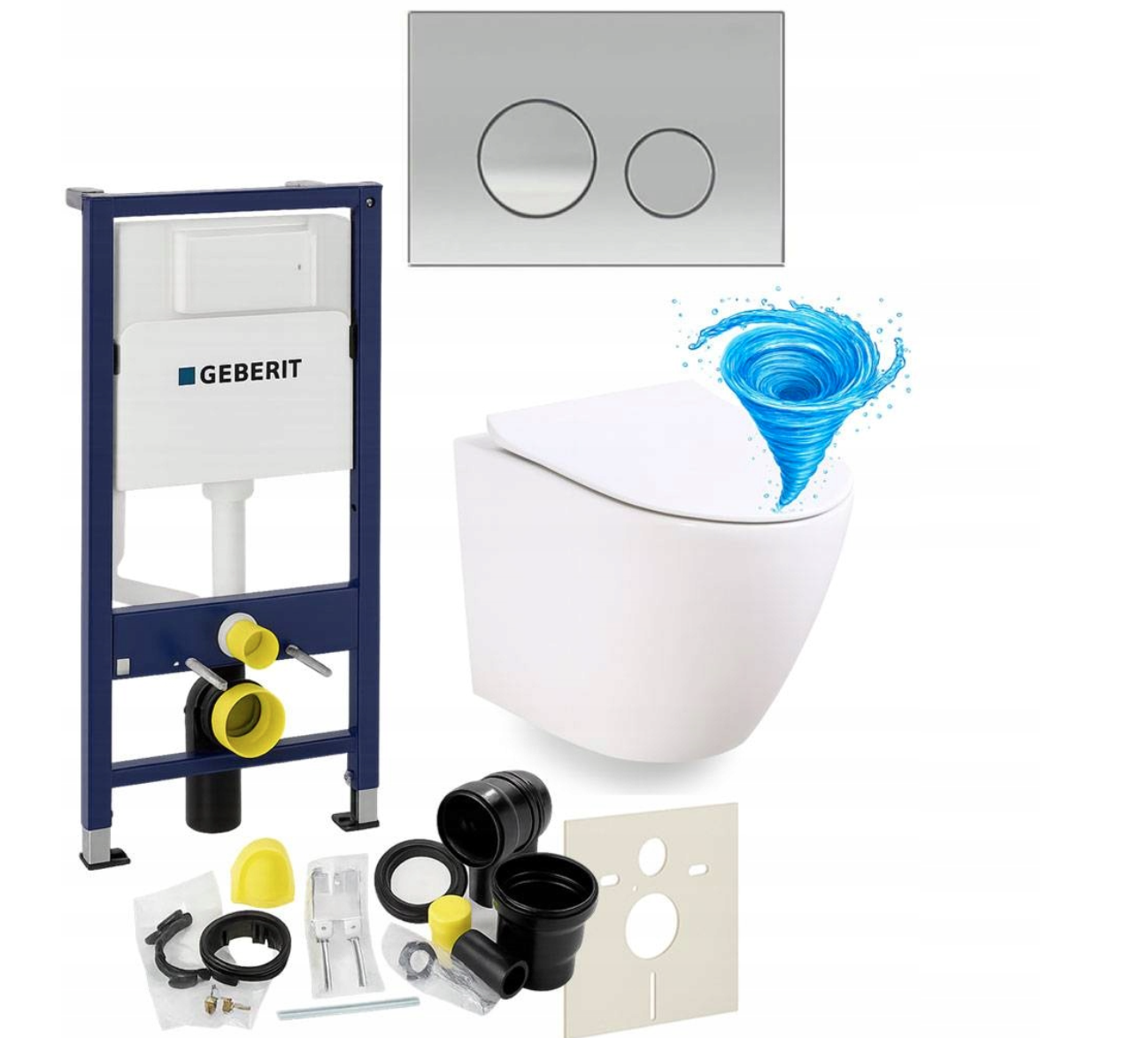 Zestaw zawiera również wszystkie elementy montażowe, w tym matę wygłuszającą, zestaw przyłączeniowy z rurą spłukującą, kolankiem odpływowym i uszczelkami oraz śruby, wsporniki i zaślepki, dzięki czemu instalacja jest szybka i wygodna. System przeznaczony jest do montażu w ścianie murowanej lub zabudowie z płyt gipsowo-kartonowych i kompatybilny z miskami WC wiszącymi o rozstawie otworów 18 cm lub 23 cm oraz przyciskami Geberit Delta.