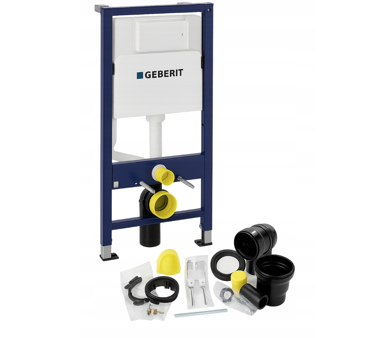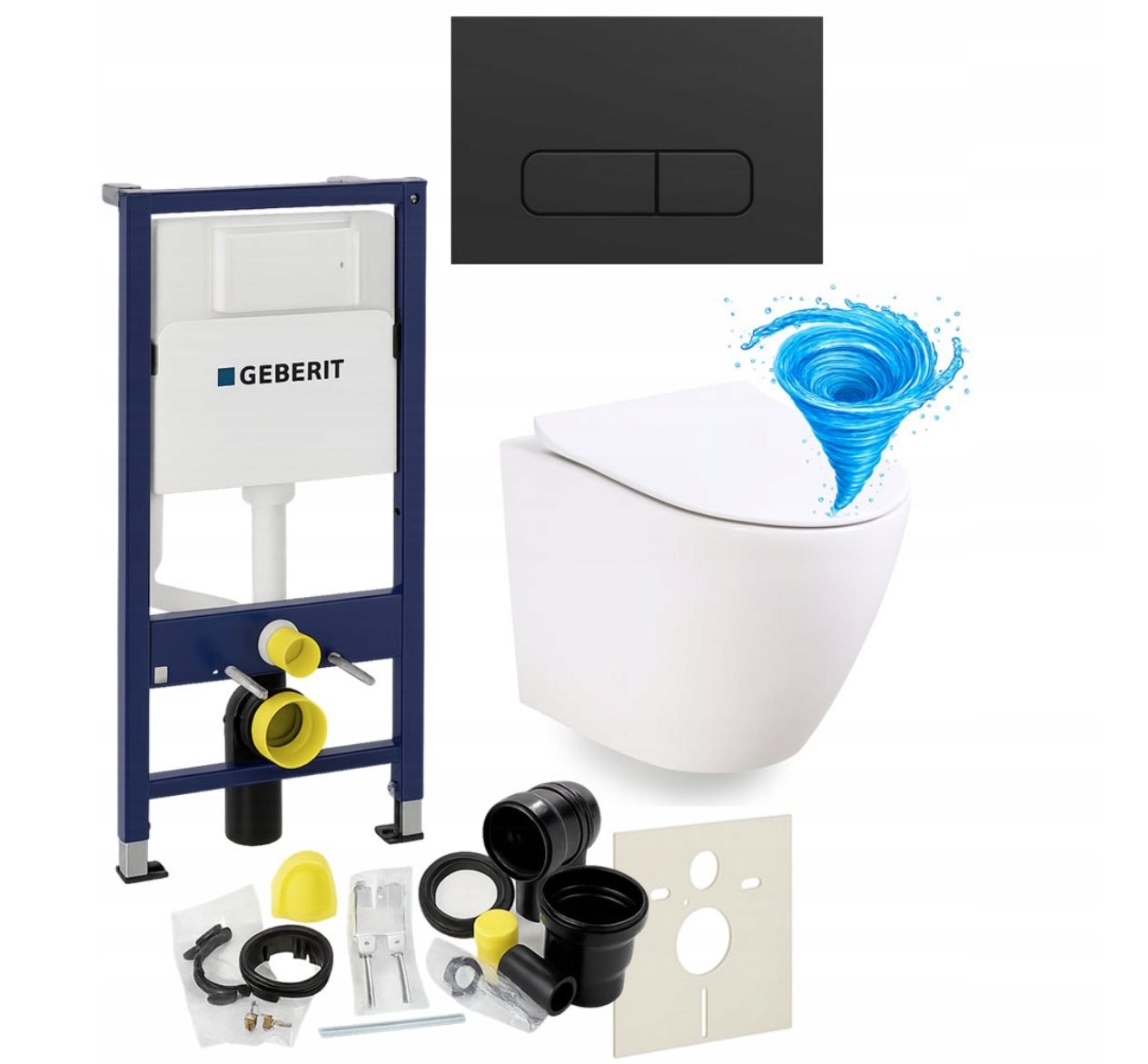 Zestaw zawiera również wszystkie elementy montażowe, w tym matę wygłuszającą, zestaw przyłączeniowy z rurą spłukującą, kolankiem odpływowym i uszczelkami oraz śruby, wsporniki i zaślepki, dzięki czemu instalacja jest szybka i wygodna. System przeznaczony jest do montażu w ścianie murowanej lub w zabudowie z płyt gipsowo-kartonowych i kompatybilny z miskami WC o rozstawie 18 cm lub 23 cm oraz przyciskami Geberit Delta.
