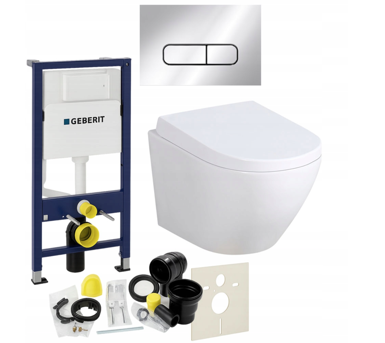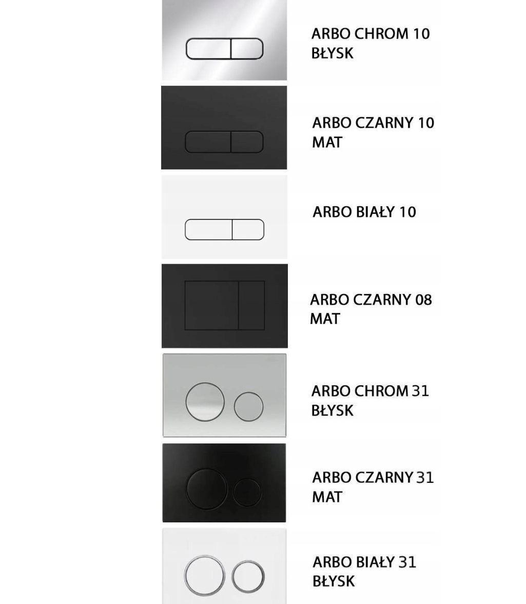 Całość uzupełnia przycisk spłukujący ARBO CHROM BŁYSK 10, który podkreśla elegancki i nowoczesny charakter zestawu. W komplecie znajdują się również wszystkie elementy instalacyjne, w tym mata wygłuszająca, zestaw przyłączeniowy (rura, kolanko, uszczelki) oraz zestaw montażowy, co pozwala na szybki i bezproblemowy montaż bez konieczności dokupowania dodatkowych akcesoriów. Zestaw przeznaczony jest do montażu w ścianach murowanych oraz zabudowie z płyt gipsowo-kartonowych i kompatybilny z miskami WC wiszącymi o rozstawie 18 cm lub 23 cm, dzięki czemu sprawdzi się w różnych aranżacjach łazienkowych.