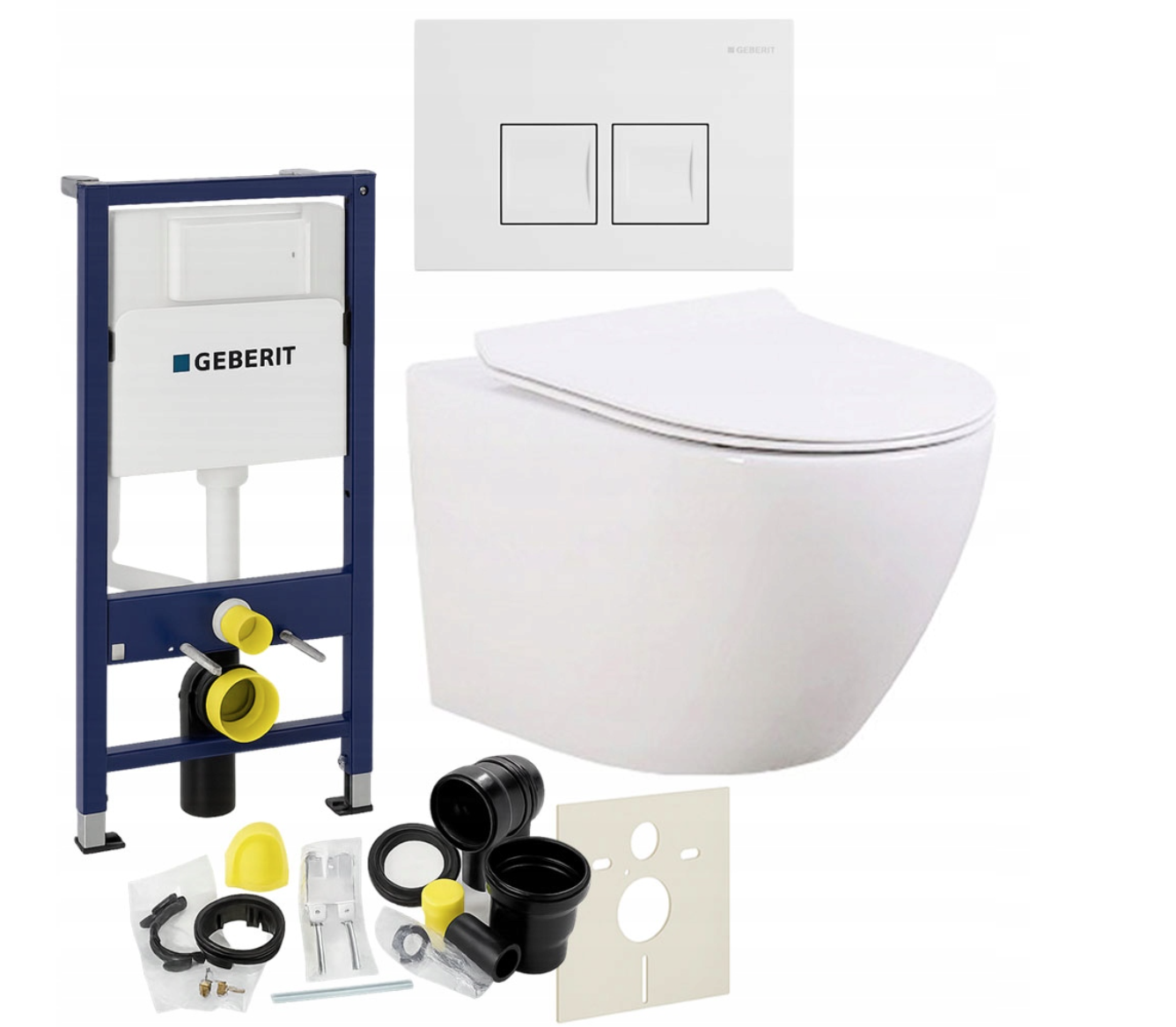 Zestaw zawiera również wszystkie elementy montażowe, w tym matę wygłuszającą, zestaw przyłączeniowy z rurą spłukującą, kolankiem odpływowym i uszczelkami oraz śruby, wsporniki i zaślepki, dzięki czemu instalacja jest szybka i wygodna. System przeznaczony jest do montażu w ścianie murowanej lub zabudowie z płyt gipsowo-kartonowych i kompatybilny z miskami WC wiszącymi o rozstawie 18 cm lub 23 cm oraz przyciskami Geberit Delta.