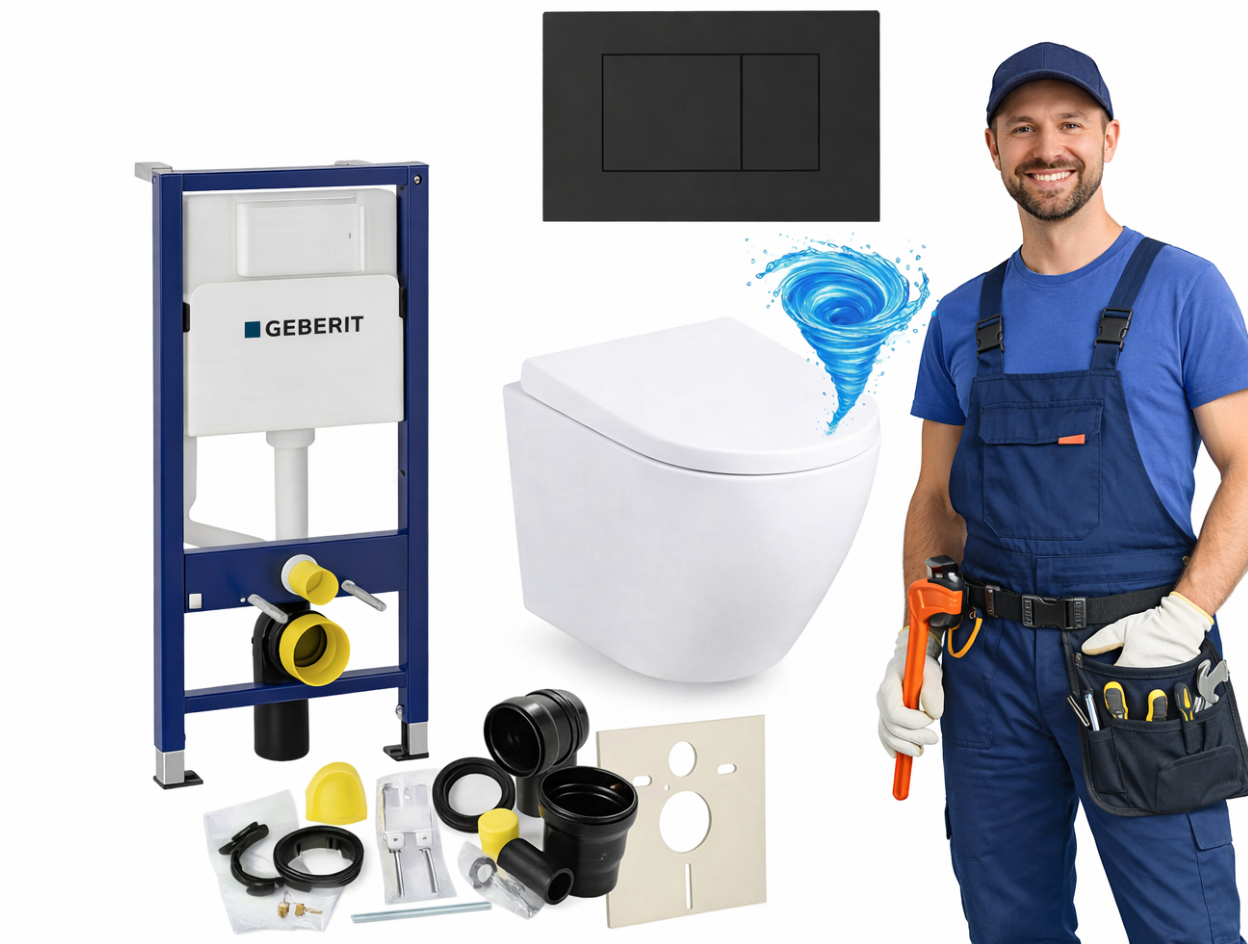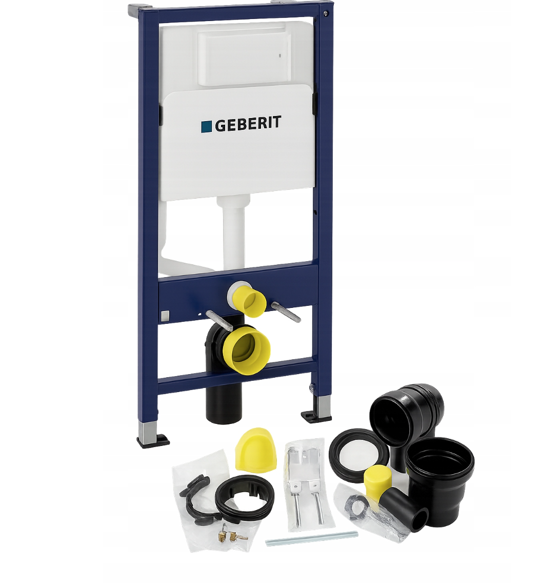 Sercem zestawu jest stelaż podtynkowy Geberit UP100, ceniony za trwałość i niezawodność. Samonośna stalowa rama malowana proszkowo zapewnia stabilność konstrukcji oraz wytrzymałość do 400 kg, a regulowane nogi w zakresie 0–20 cm umożliwiają dopasowanie wysokości montażu do warunków instalacyjnych. Spłuczka wyposażona jest w dwudzielny system spłukiwania, który pozwala ograniczyć zużycie wody, a także w izolację przeciwroszeniową, chroniącą przed skraplaniem wilgoci. System umożliwia regulację ilości wody spłukującej, natychmiastowe ponowne spłukiwanie oraz podłączenie wody od góry lub z tyłu, co zwiększa elastyczność instalacji.