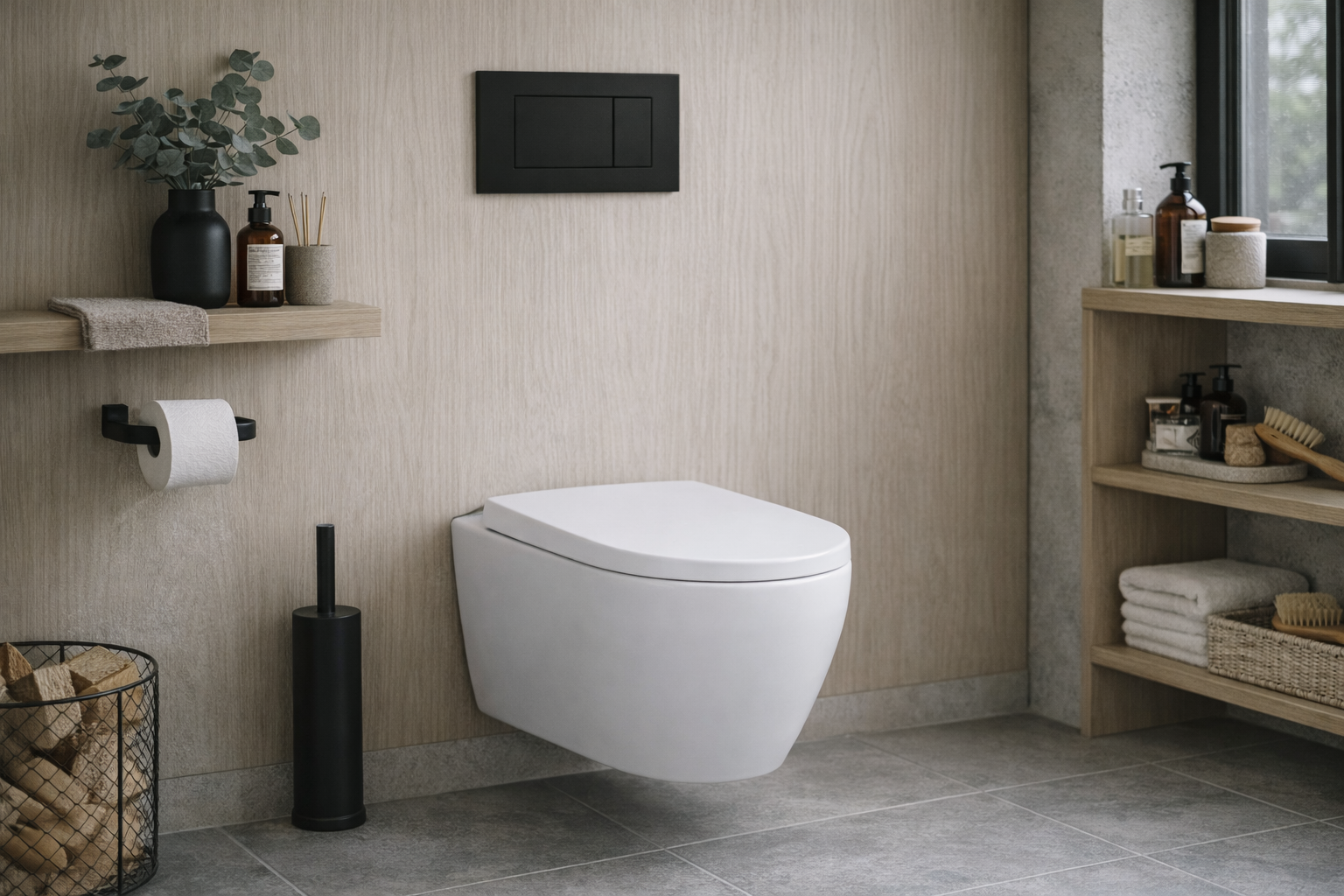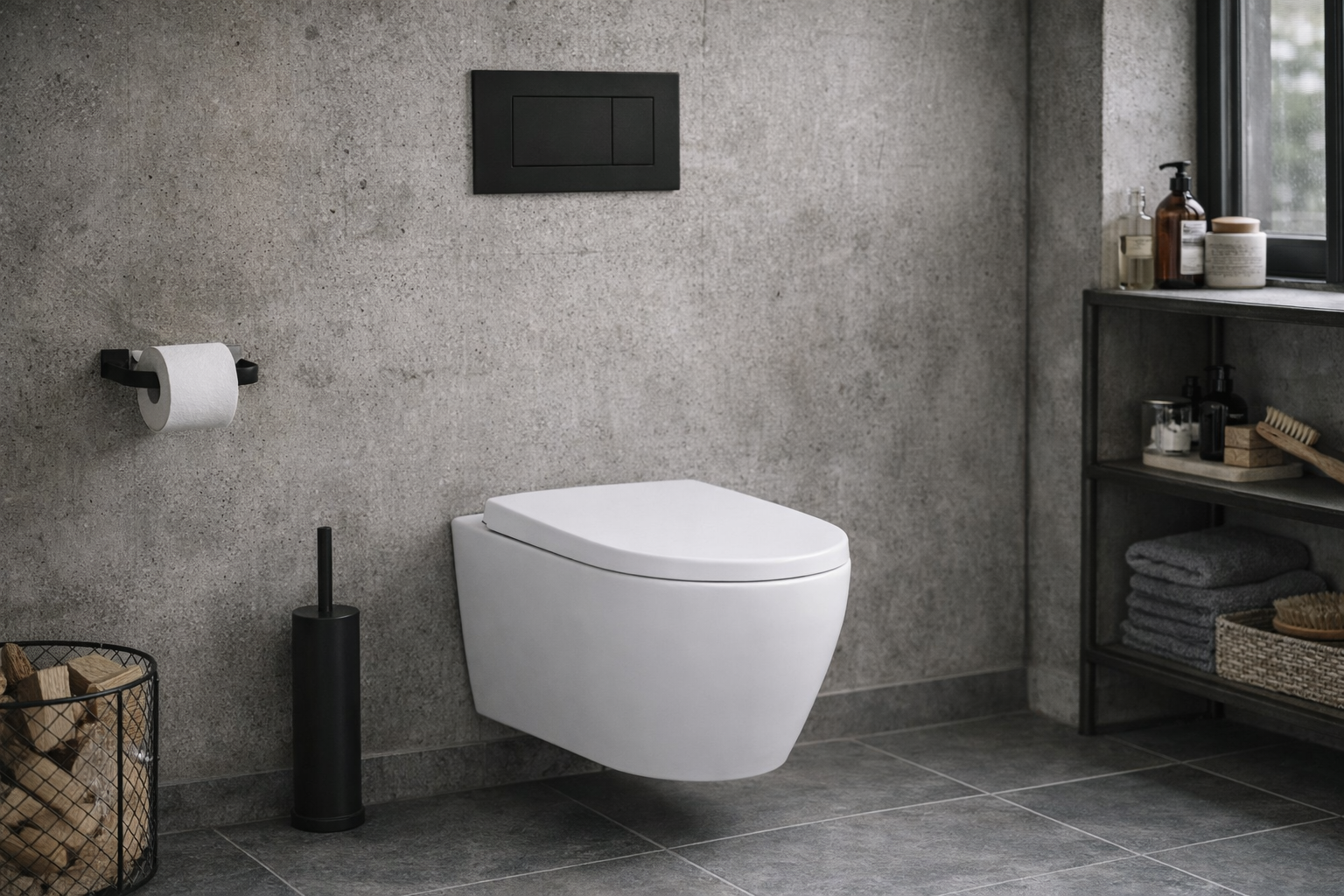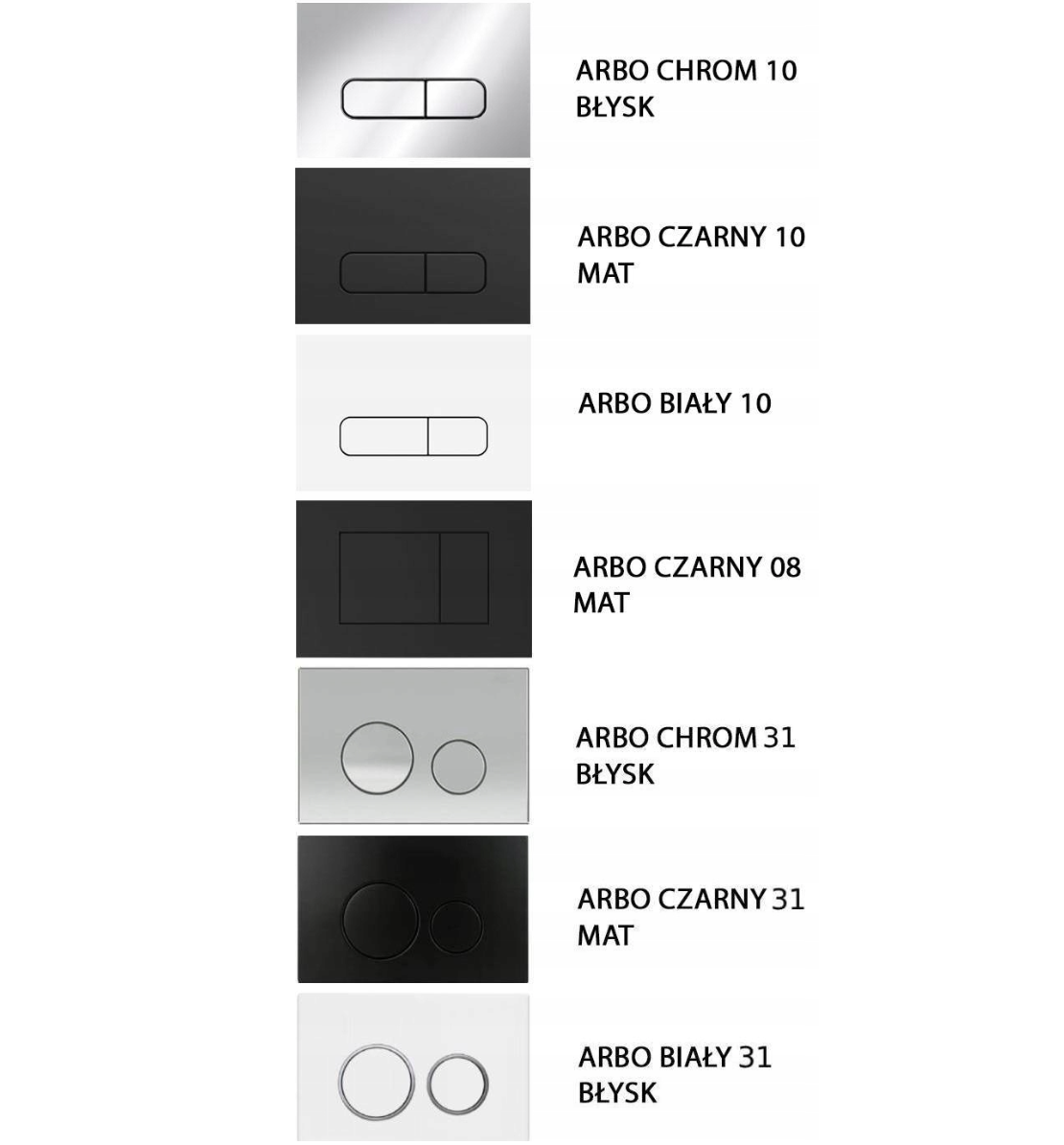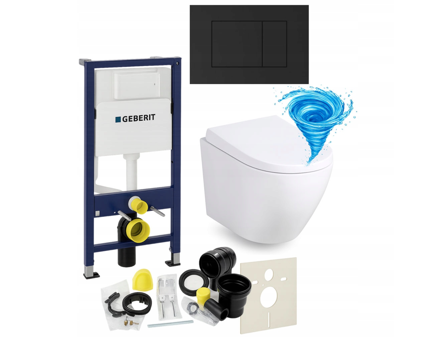 W zestawie znajduje się miska WC ARBO TORNADO wykonana z wysokiej jakości ceramiki sanitarnej. Bezkołnierzowa konstrukcja ogranicza gromadzenie się zabrudzeń i bakterii, co znacząco ułatwia utrzymanie higieny. Do kompletu dołączona jest deska sedesowa wolnoopadająca, która zapewnia ciche zamykanie oraz łatwe wypinanie do czyszczenia. Całość uzupełnia przycisk spłukujący Geberit ABRO w kolorze czarnym, który nadaje zestawowi elegancki i nowoczesny charakter.