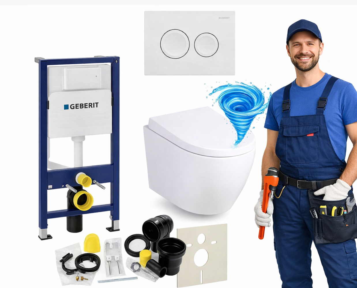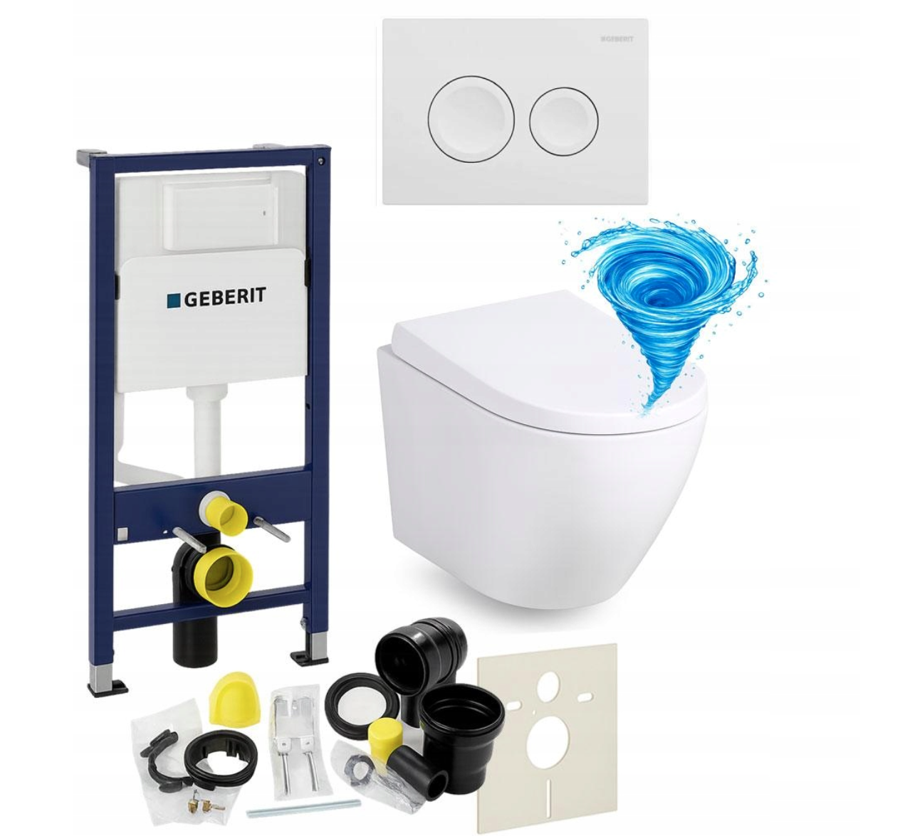 Zestaw zawiera również wszystkie elementy montażowe, w tym matę wygłuszającą, zestaw przyłączeniowy z rurą spłukującą, kolankiem odpływowym i uszczelkami oraz śruby, wsporniki i zaślepki, dzięki czemu instalacja jest szybka i wygodna. System przeznaczony jest do montażu w ścianie murowanej lub zabudowie z płyt gipsowo-kartonowych i kompatybilny z miskami WC o rozstawie 18 cm lub 23 cm oraz przyciskami Geberit Delta.