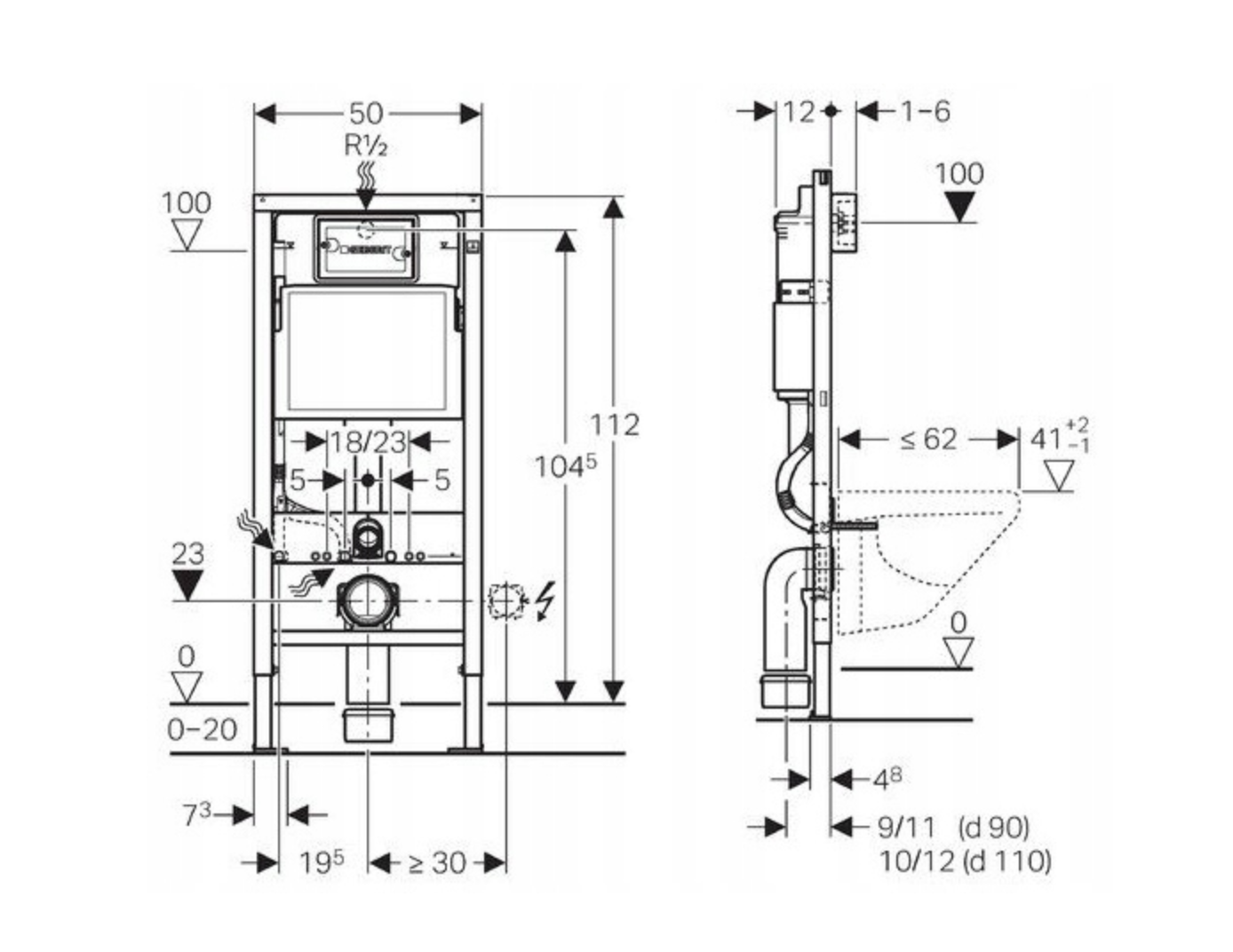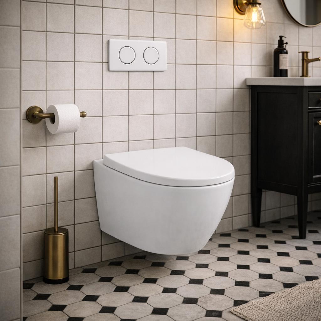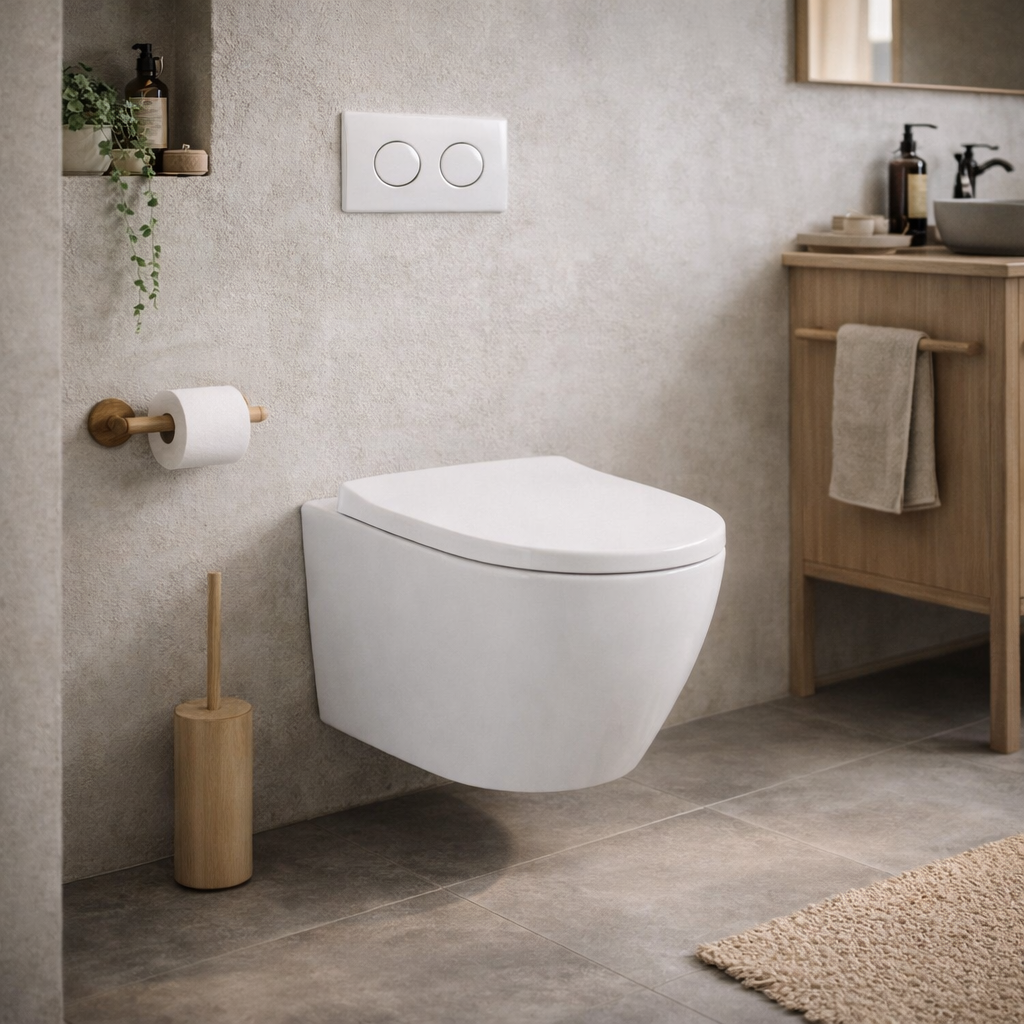 Sercem zestawu jest stelaż podtynkowy Geberit UP100, ceniony za trwałość i niezawodność. Samonośna stalowa rama malowana proszkowo zapewnia stabilność konstrukcji oraz wytrzymałość do 400 kg, a regulowane nogi w zakresie 0–20 cm umożliwiają dopasowanie wysokości montażu do warunków instalacyjnych. Spłuczka wyposażona jest w dwudzielny system spłukiwania, który pozwala ograniczyć zużycie wody, a także w izolację przeciwroszeniową, chroniącą przed skraplaniem wilgoci. System umożliwia regulację ilości wody spłukującej, natychmiastowe ponowne spłukiwanie oraz podłączenie wody od góry lub z tyłu, co zwiększa elastyczność instalacji.