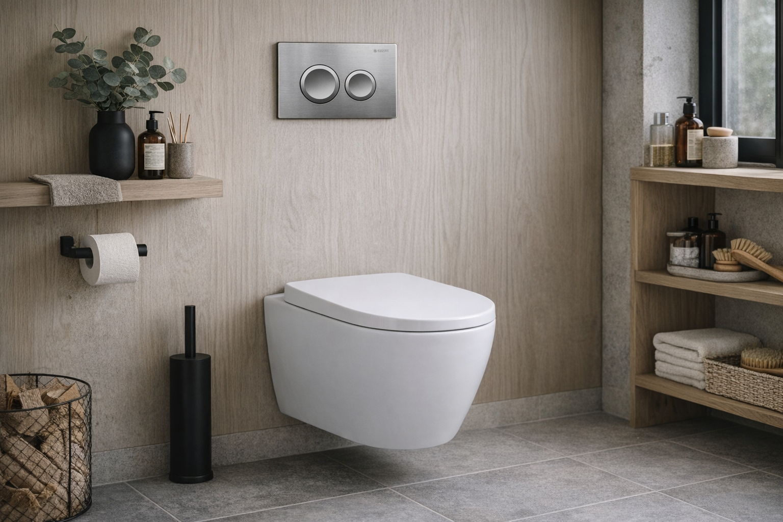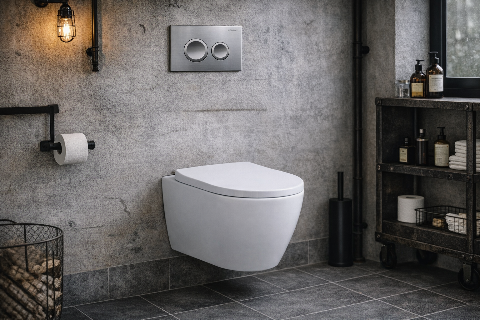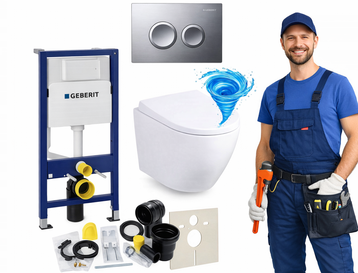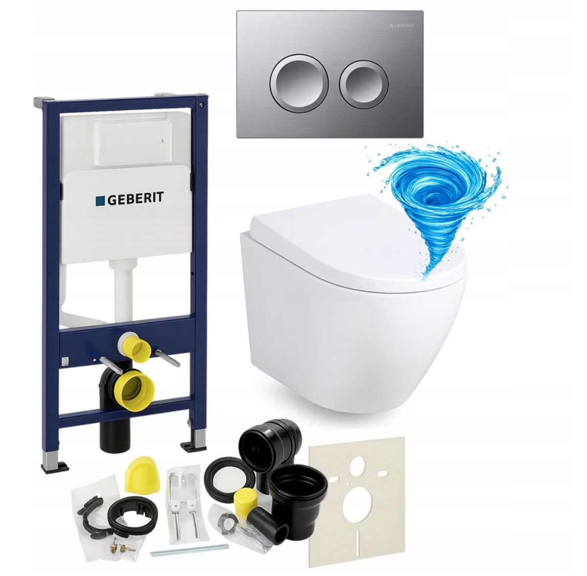 Sercem zestawu jest stelaż podtynkowy Geberit UP100, ceniony za trwałość i niezawodność. Samonośna stalowa rama malowana proszkowo zapewnia stabilność konstrukcji oraz wytrzymałość do 400 kg, a regulowane nogi w zakresie 0–20 cm umożliwiają dopasowanie wysokości montażu do warunków instalacyjnych. Spłuczka wyposażona jest w dwudzielny system spłukiwania, który pozwala ograniczyć zużycie wody, a także w izolację przeciwroszeniową, chroniącą przed skraplaniem wilgoci. System umożliwia regulację ilości wody spłukującej, natychmiastowe ponowne spłukiwanie oraz podłączenie wody od góry lub z tyłu, co zwiększa elastyczność instalacji.
