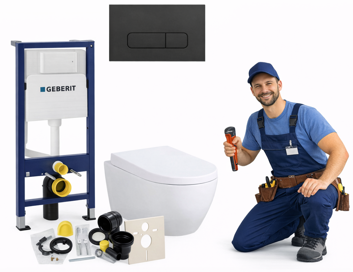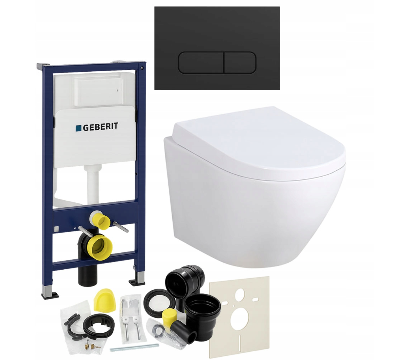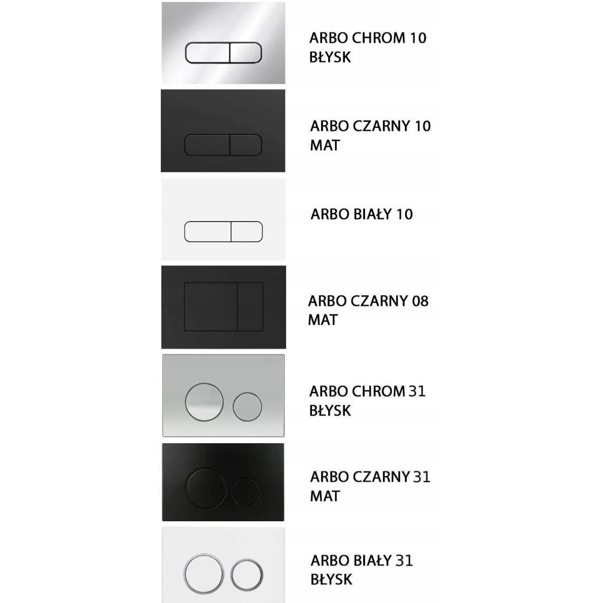 Całość uzupełnia przycisk spłukujący ARBO w wykończeniu czarnym, który podkreśla elegancki i nowoczesny charakter zestawu. W komplecie znajdują się również wszystkie elementy instalacyjne, w tym mata wygłuszająca, zestaw przyłączeniowy (rura, kolanko, uszczelki) oraz zestaw montażowy, co pozwala na szybki i bezproblemowy montaż bez konieczności dokupowania dodatkowych akcesoriów. Zestaw przeznaczony jest do montażu w ścianach murowanych oraz zabudowie z płyt gipsowo-kartonowych i kompatybilny z miskami WC wiszącymi o rozstawie 18 cm lub 23 cm, dzięki czemu sprawdzi się w różnych aranżacjach łazienkowych.
