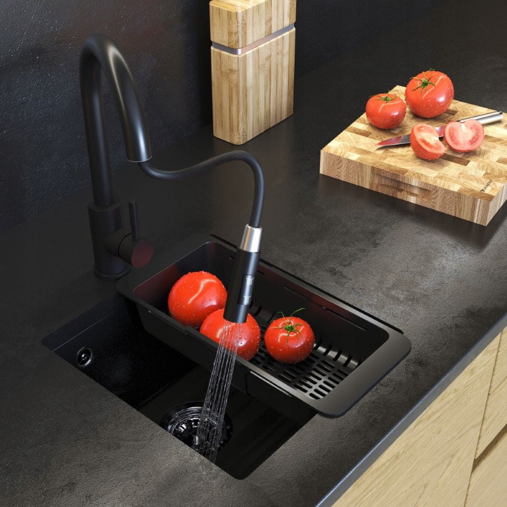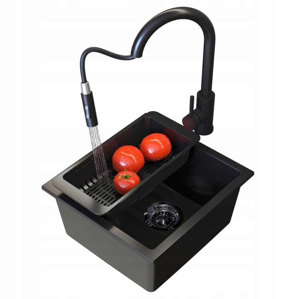 ● Zlewozmywak NANO to minimalistyczny model o kompaktowych wymiarach, który idealnie wpasowuje się w małe kuchnie, aneksy kuchenne czy miejsca o ograniczonej przestrzeni. Zlew ma nowoczesne, matowe wykończenie w głębokiej czerni, co dodaje elegancji. Wykonany z wytrzymałego materiału, cechuje się odpornością na zarysowania, wysoką temperaturę i środki chemiczne.