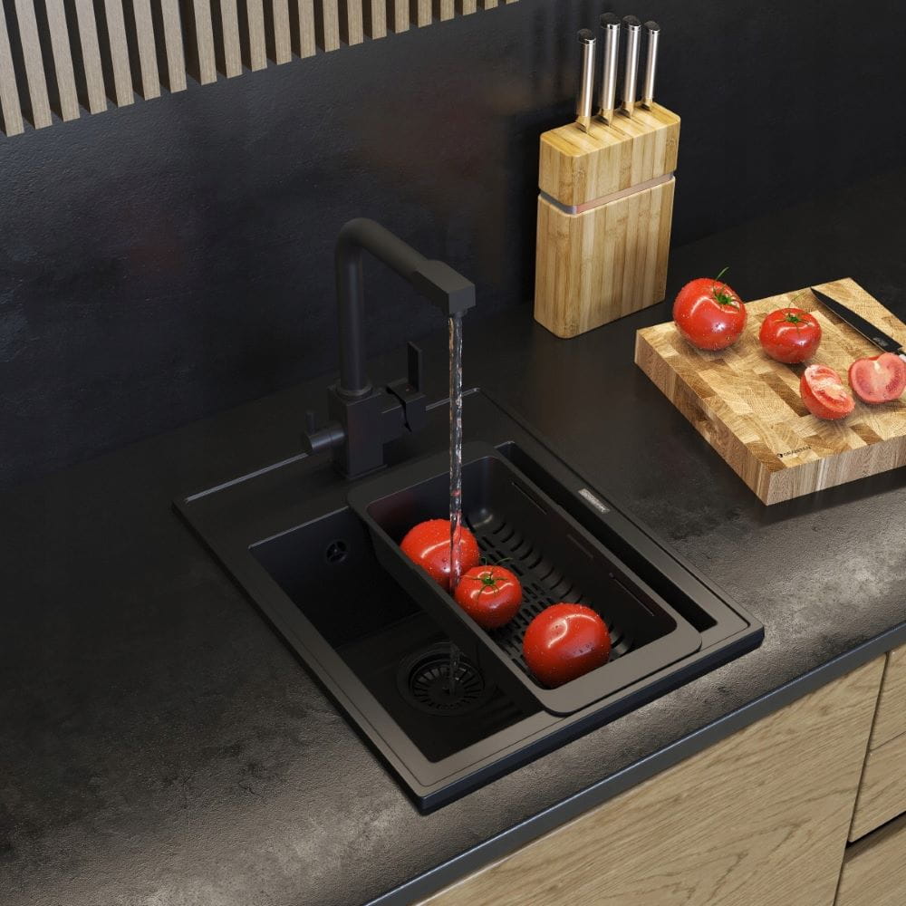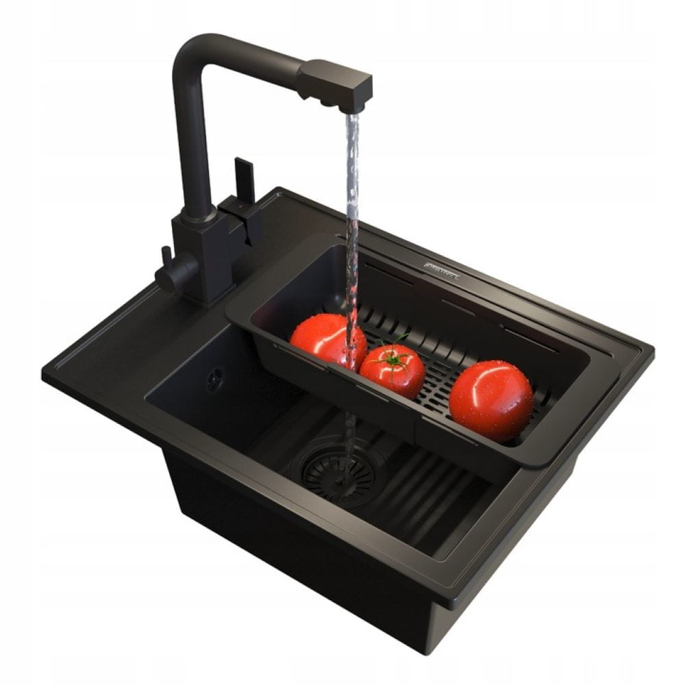 Zestaw - zlew granitowy czarny Nero - bateria trójdrożna Nero - koszyk - syfon