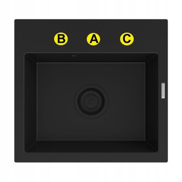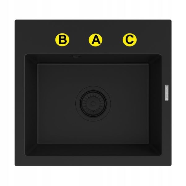 Miejsca w których mogą być wykonane otwory zostały oznaczone na rysunku: A, B, C. Istnieje także opcja zakupu zlewozmywaka bez nawierconych otworów. Wszystkie otwory wykonujemy bezpłatnie.