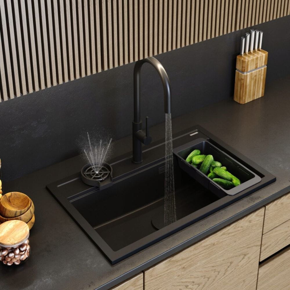Zestaw - zlew granitowy czarny duży - kran - ociekarka - myjka - maskownica - Asti