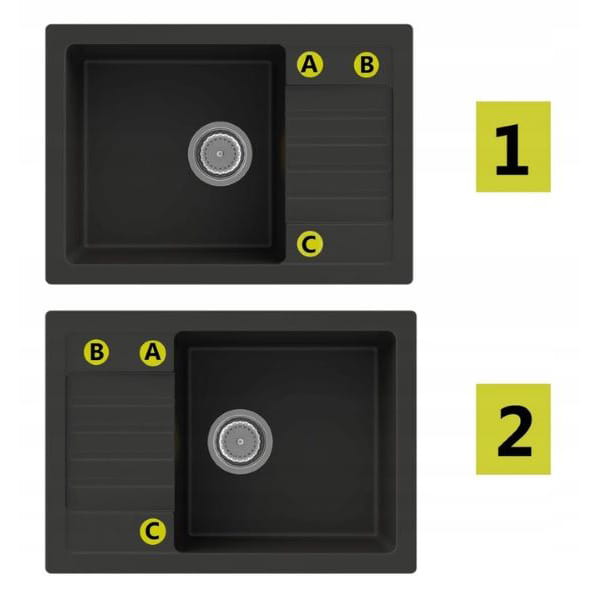 Istnieje możliwość BEZPŁATNEGO nawiercenia otworów. Miejsca, w których mogą być wykonane zostały oznaczone symbolami: A, B i C. Strony komory zostały oznaczone opcjami: 1 i 2.