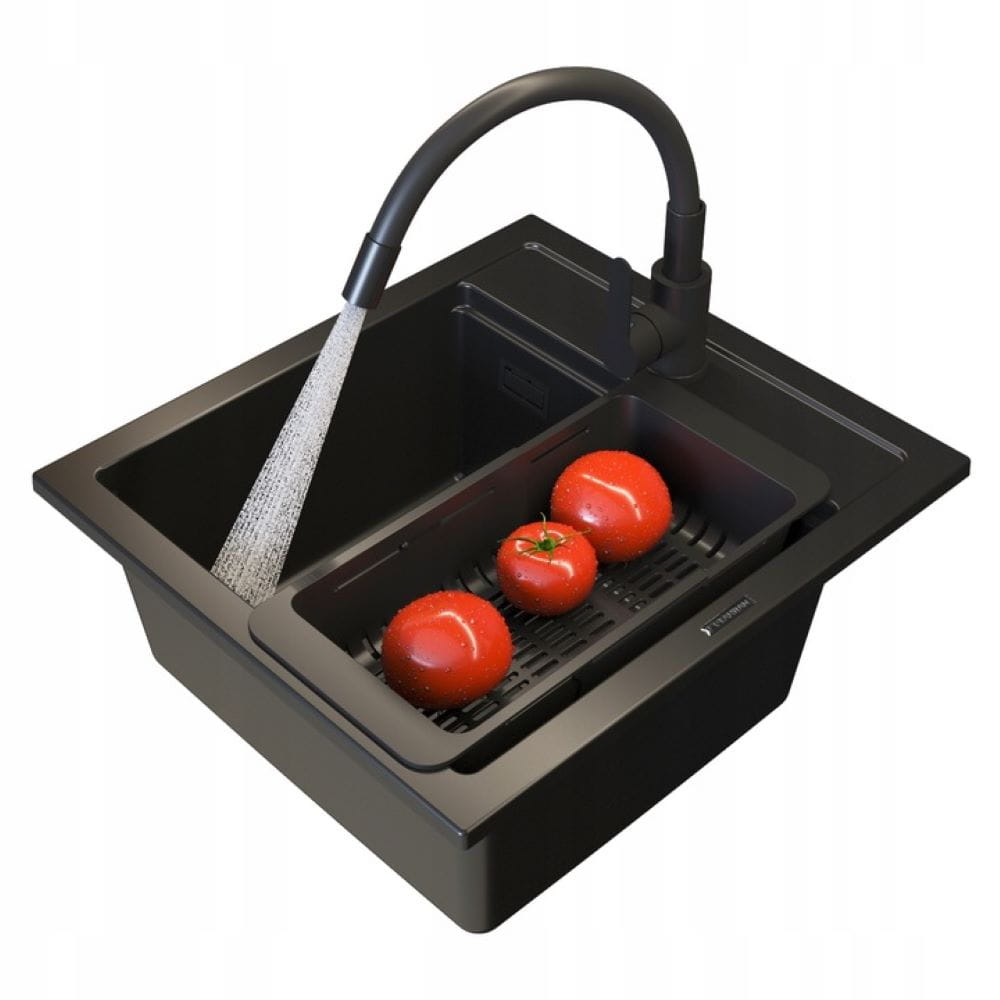 ● Ociekarka/koszyk do zlewu. Dzięki regulacji koszyk pasuje do większości zlewozmywaków dostępnych na rynku.