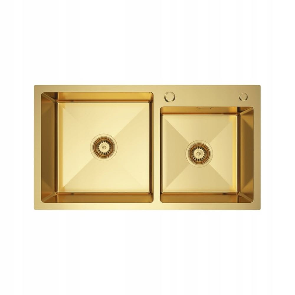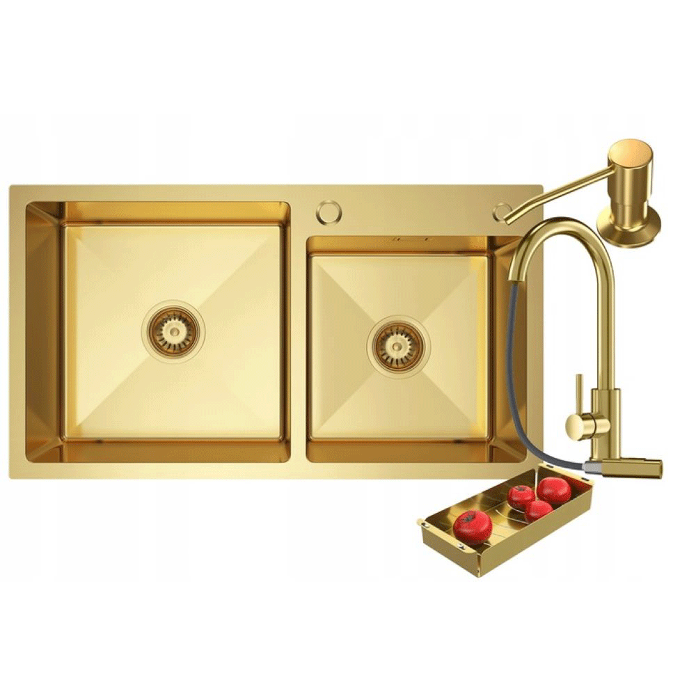 Zestaw - zlew stalowy 2-komorowy złoty 78x45 - bateria - dozownik - syfon
