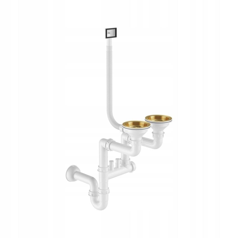 ● Stylowy syfon w złotym kolorze idealny do zlewozmywaków dwukomorowych. Kompaktowa konstrukcja pozwala na montaż w szafkach o ograniczonej przestrzeni. Wykonany z trwałych materiałów odpornych na wilgoć i detergenty.