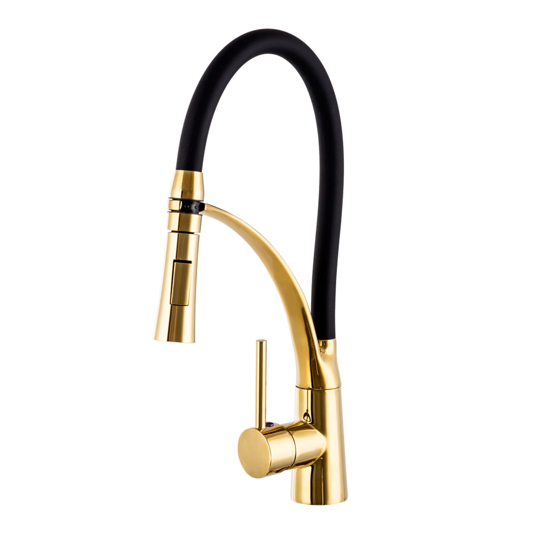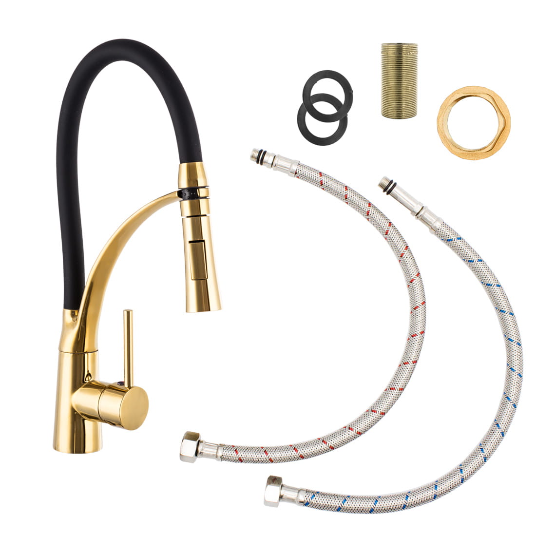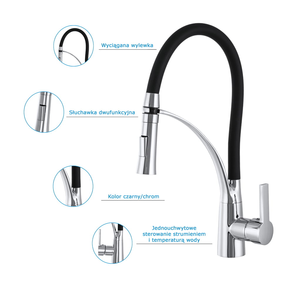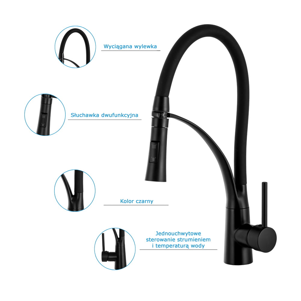 ● Bateria kuchenna NEXO wykonana z mosiądzu, powłoka odporna na zarysowania i przebarwienia, ceramiczna głowica (35mm), otwór do montażu (35mm), wysokość baterii 430mm, zasięg wylewki 210mm, obrotowa, wyciągana wylewka 360’, słuchawka 2-funkcyjna. W komplecie baterii otrzymują Państwo baterię, mocowanie do zlewu, wężyki montażowe oraz kartę gwarancyjną. 3 kolory do wyboru: złota, czarna, chrom.