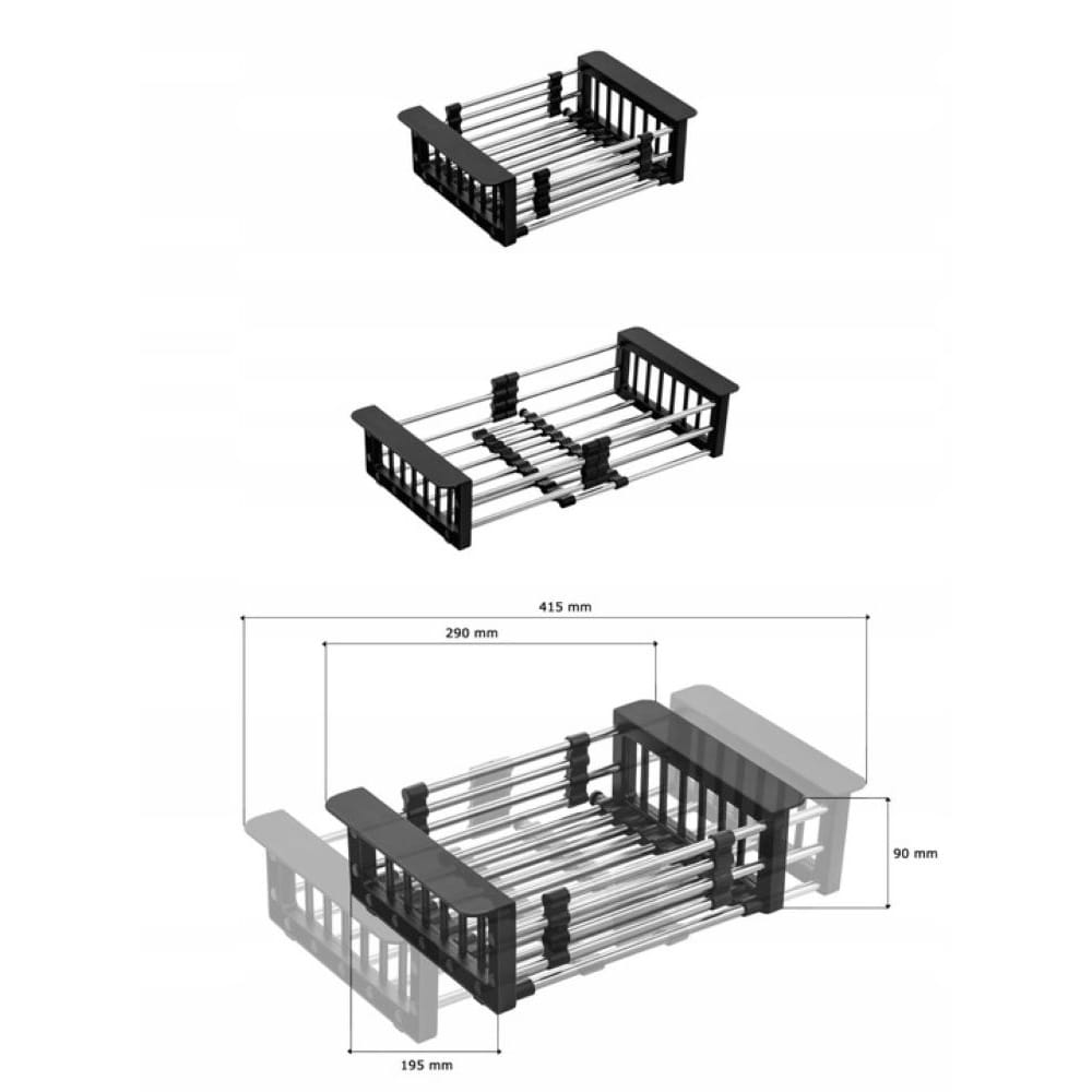 ● Teleskopowa ociekarka do zlewu. Wymiary (produkt złożony): 29 cm x 19,5 cm x 9 cm, maksymalne wymiary (po rozłożeniu): 41,5 cm x 19,5 cm x 9 cm.