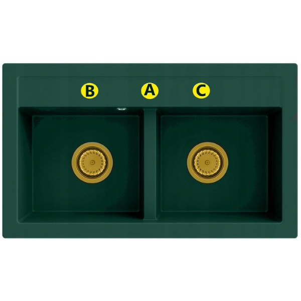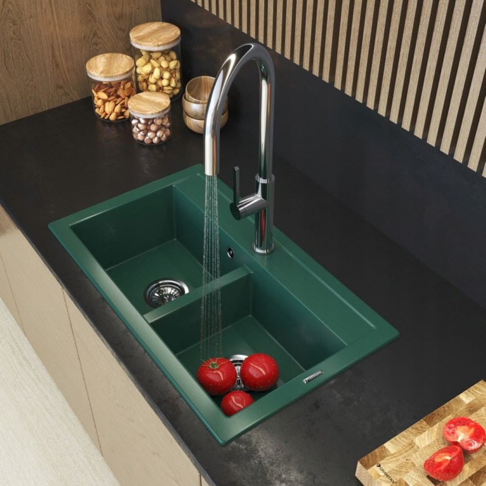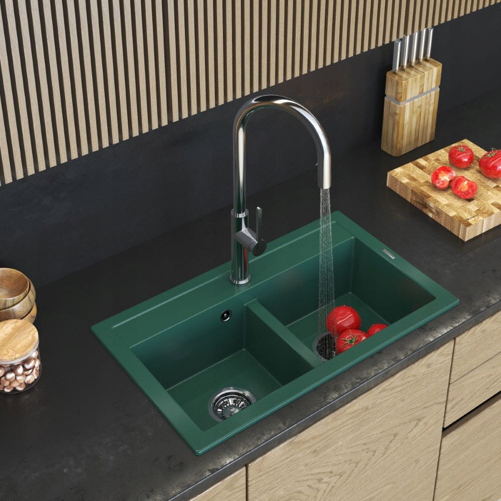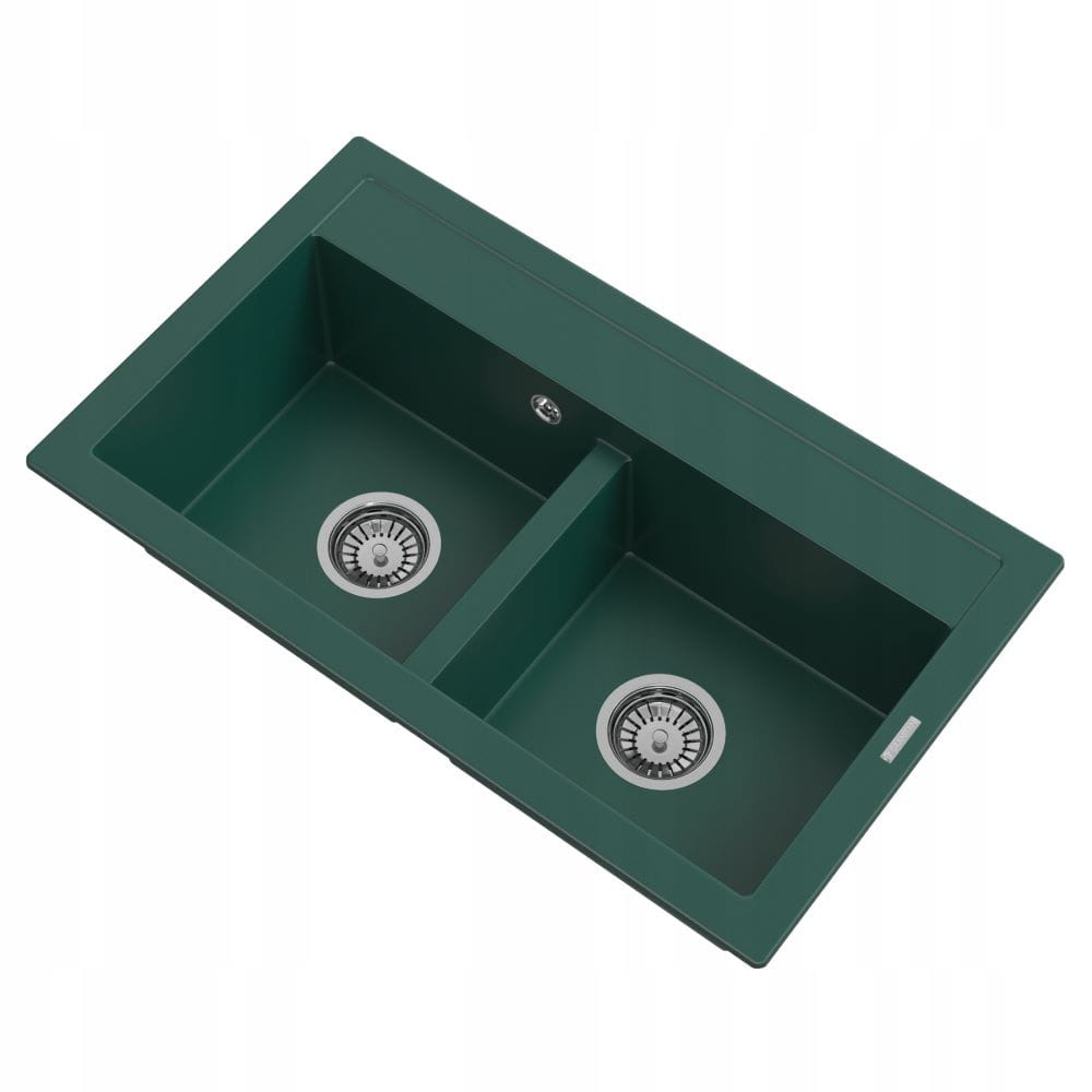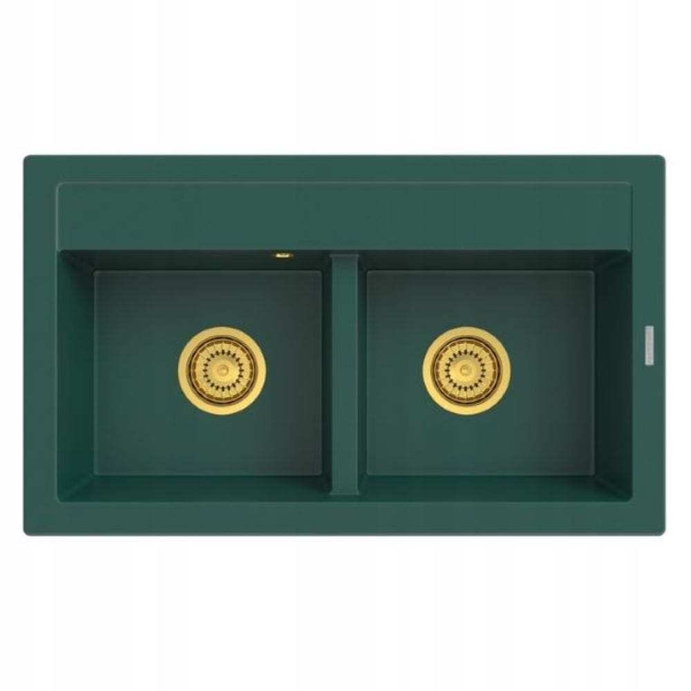 Zlewozmywak granitowy dwukomorowy butelkowa zieleń syfon złoty/chrom Duet