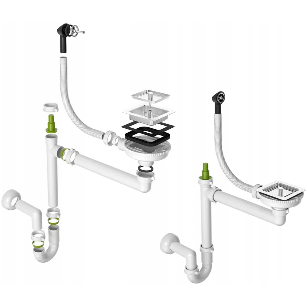 Zlewozmywak wyposażony w syfon manualny przyścienny w kolorze chrom z przelewem kwadratowym. Syfon oszczędzający przestrzeń z możliwością podłączenia pralki lub zmywarki.