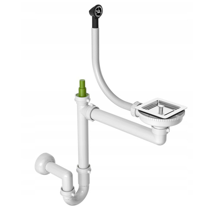 Zlewozmywak wyposażony w syfon manualny przyścienny w kolorze chrom z przelewem kwadratowym. Syfon oszczędzający przestrzeń z możliwością podłączenia pralki lub zmywarki.