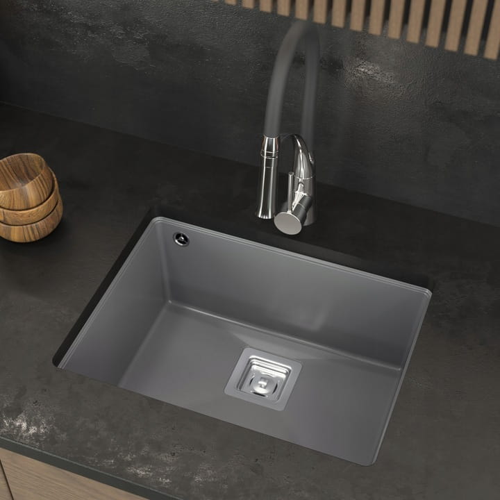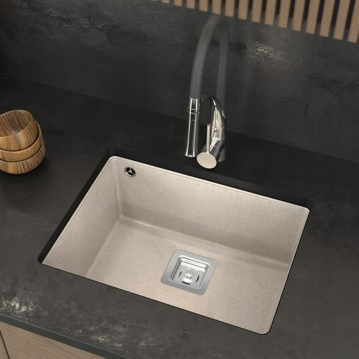 Klasyczny, geometryczny kształt w połączeniu z podblatowym systemem montażu sprawia, że zlew tworzy idealnie spójną powierzchnię z blatem kuchennym. Bogata kolorystyka, w której występuje model, pozwala bezproblemowo łączyć go z taflami kamiennymi, konglomeratami czy blatami kompozytowymi.