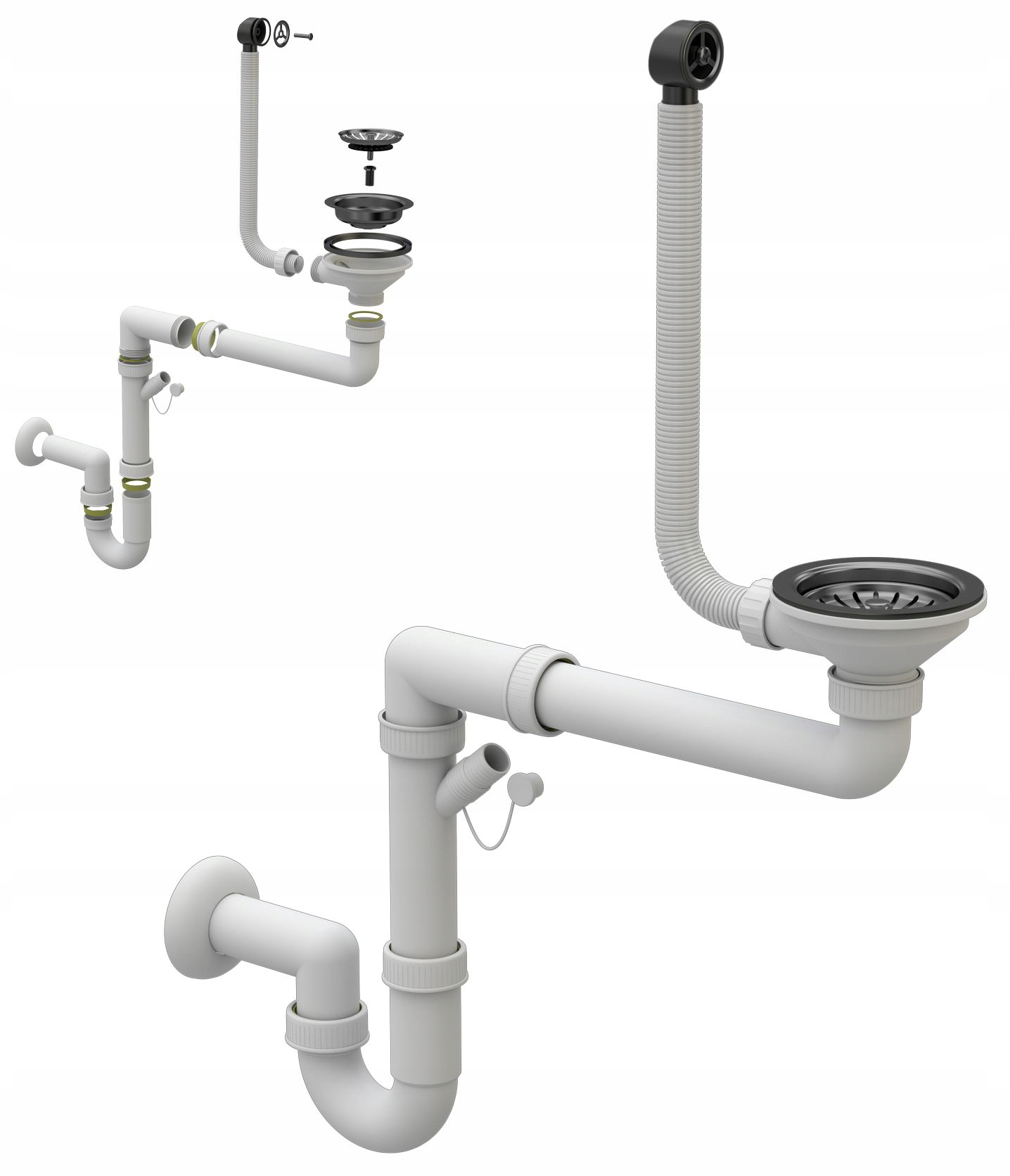 Zlewozmywak wyposażony w syfon automatyczny przyścienny w kolorze czarnym. Syfon oszczędzający przestrzeń z możliwością podłączenia pralki lub zmywarki.