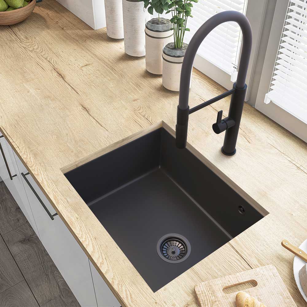 Podblatowy system montażu daje możliwość zachowania gładkiej, spójnej powierzchni z blatem kuchennym, co sprawia, że przestrzeń wygląda na bardziej estetyczną, a w praktyce zwiększa higienę podczas pracy.