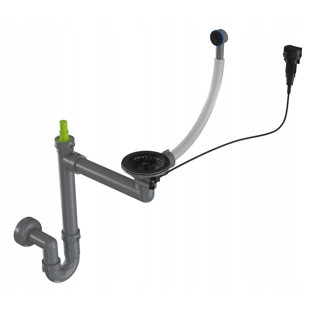 W skład zestawu wchodzą: syfon automatyczny typu space saver, oszczędzający przestrzeń w kolorze czarnym z możliwością podłączenia zmywarki lub pralki.