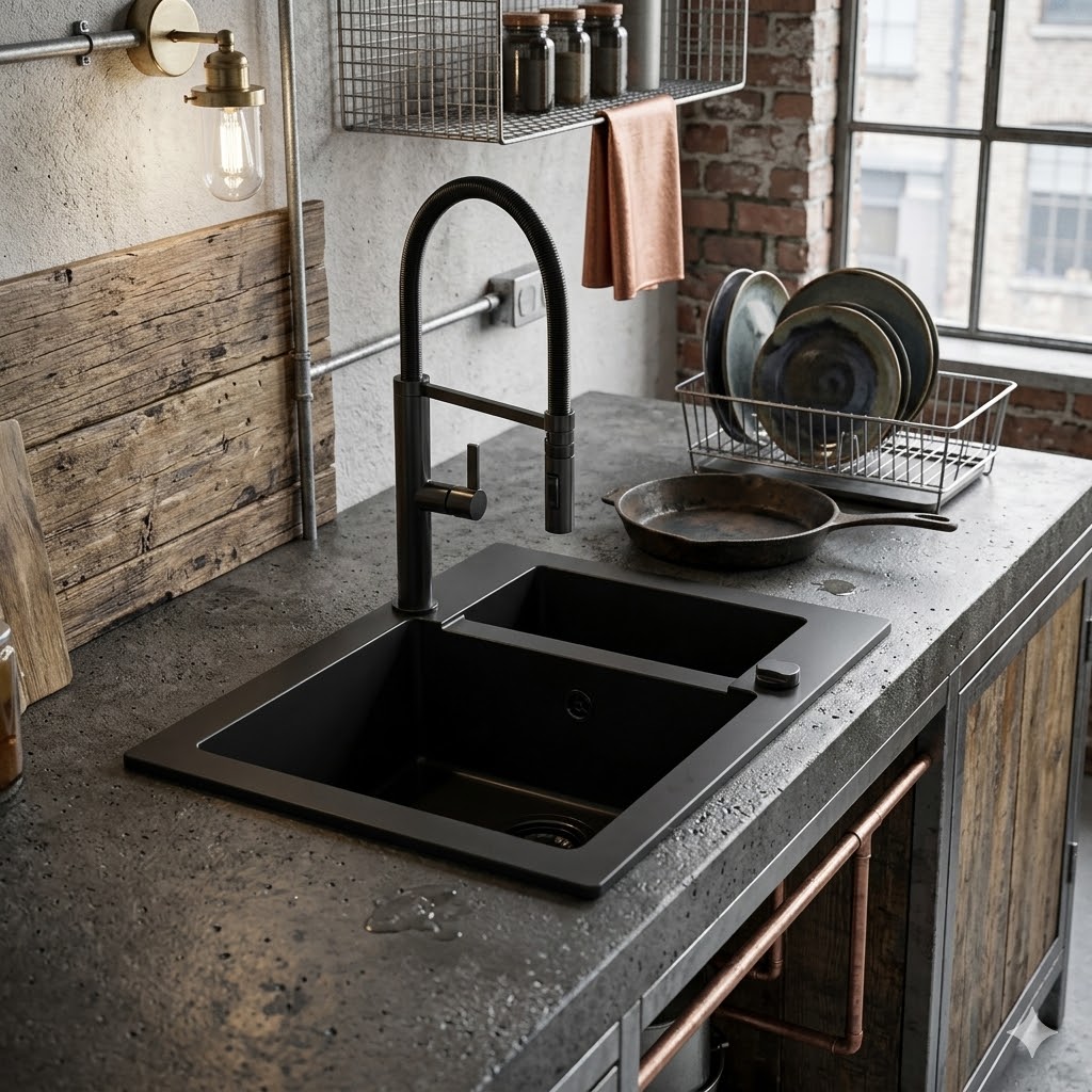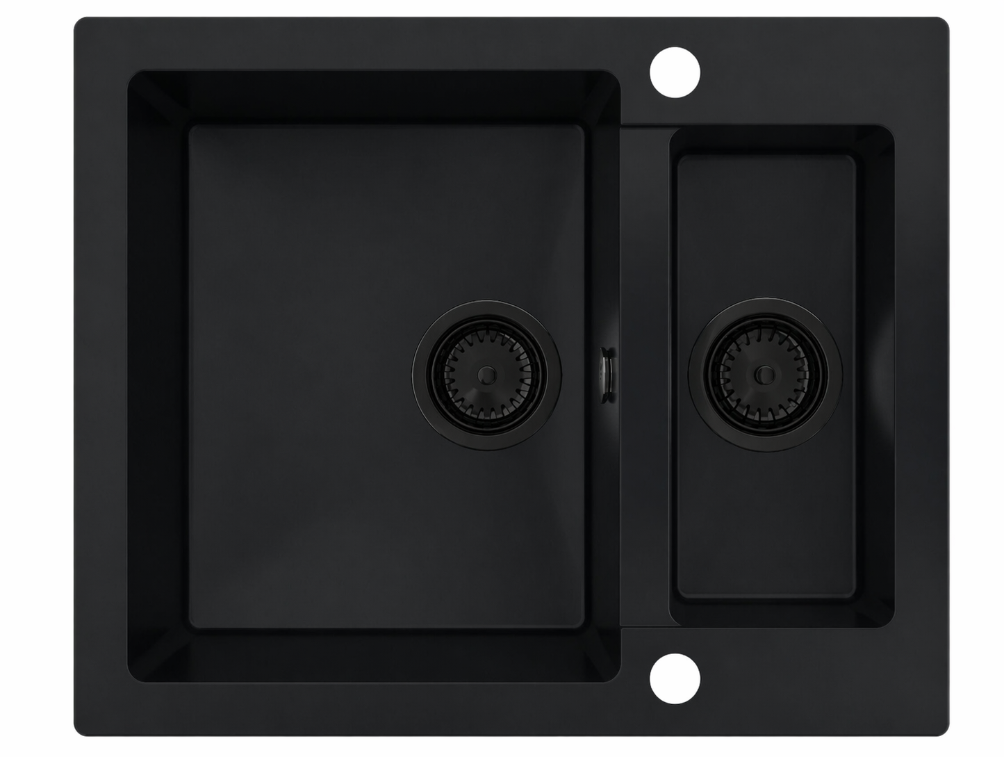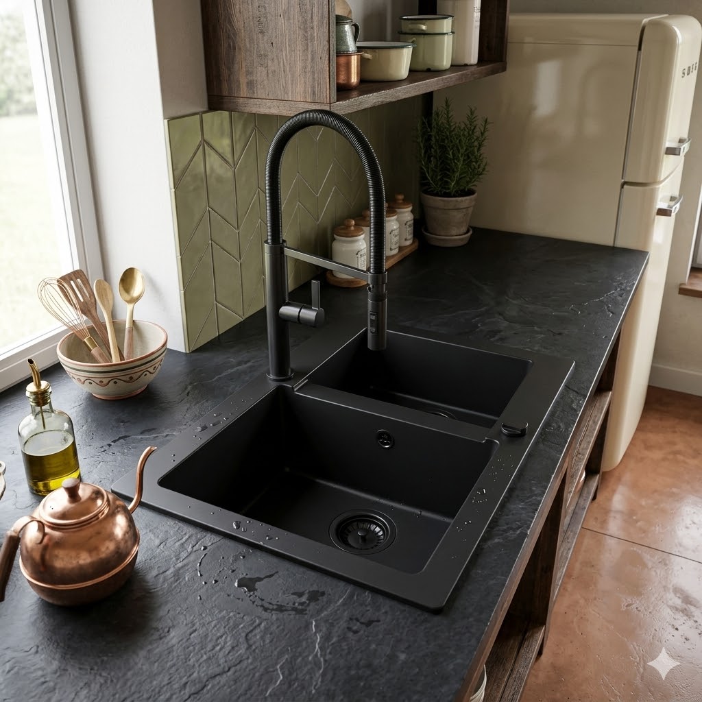 Model RASSO 60 to nowoczesny, granitowy zlewozmywak półtorakomorowy w eleganckim czarnym kolorze, który zapewnia wygodę pracy i świetną organizację przestrzeni w kuchni.